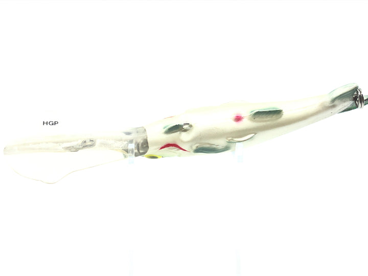 Worden's Sea Tiger HGP Green Herring Salesmen Sample. Worden's flagship Sea-Tow wobbler lure. This 7" saltwater or large freshwater game fish bait has a maximum diving depth of 24' regardless of the speed. This lure provide plenty of action, appeal and sound thanks to its hyper realistic design and the large beads inside of the lure. The sample model does come with a color code underneath the lip and has no hooks.