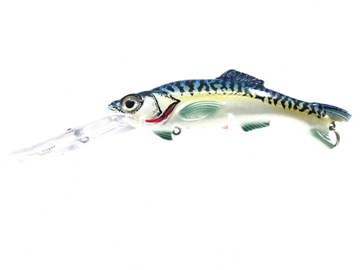 Worden's Sea Tiger 4050 MAC Mackerel Salesmen Sample. Worden's flagship Sea-Tow wobbler lure. This almost 9" saltwater or large freshwater game fish bait has a maximum diving depth of 30' regardless of the speed. This lure provide plenty of action, appeal and sound thanks to its hyper realistic design and the large beads inside of the lure. The sample model unfortunately comes with a color code underneath the lip and has no hooks.