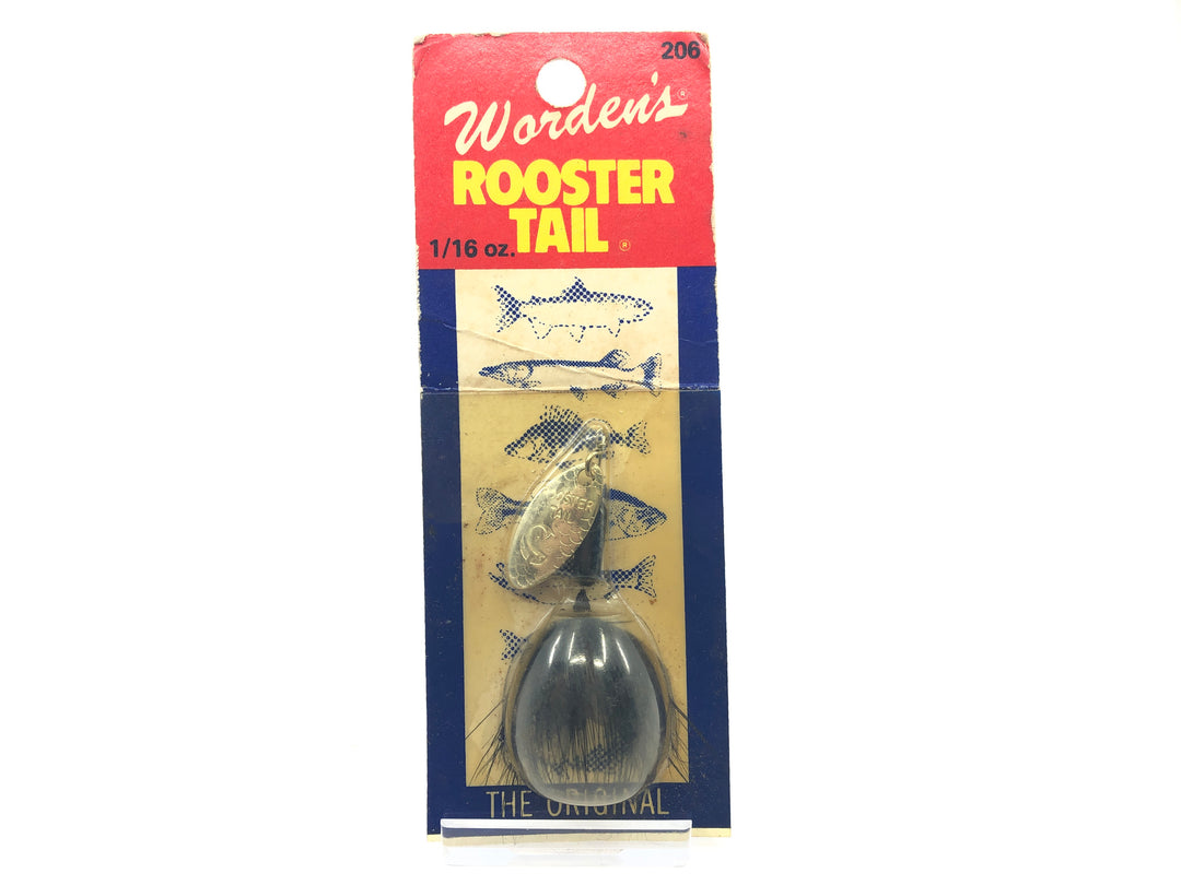Worden's Rooster Tail 206 BL Black New Old Stock. Great small spinner bait. Weighs about 1/6 oz. Fish or collect. See photos.