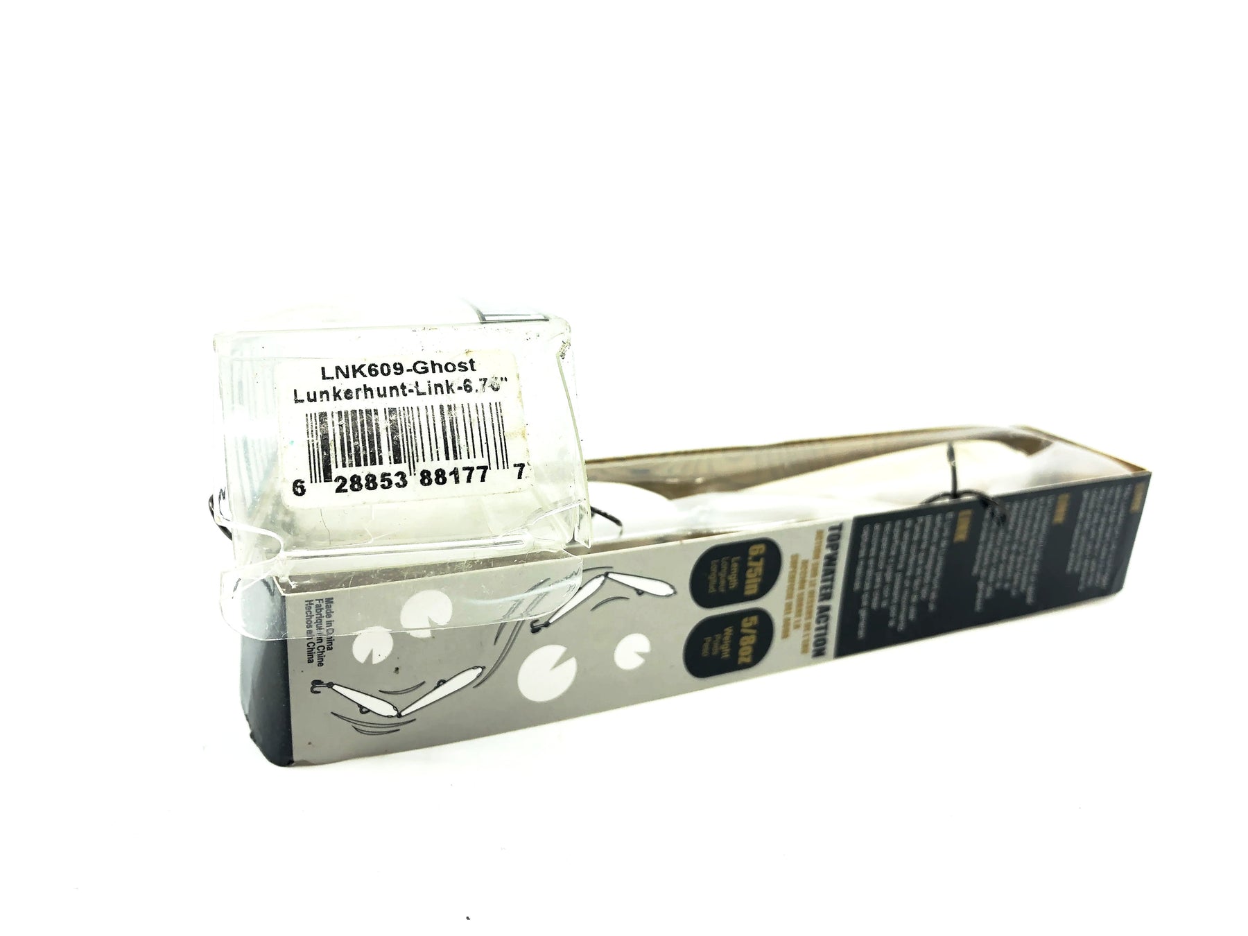 Lunkerhunt Link 6.75", Ghost Color with Box. Great premium bait here for any fishermen. About 6 3/4" long and weighing 5/8oz. Box is in good condition with some wear and marks. Lure is new in box. Great deal on a bait perfect for any fishermen.