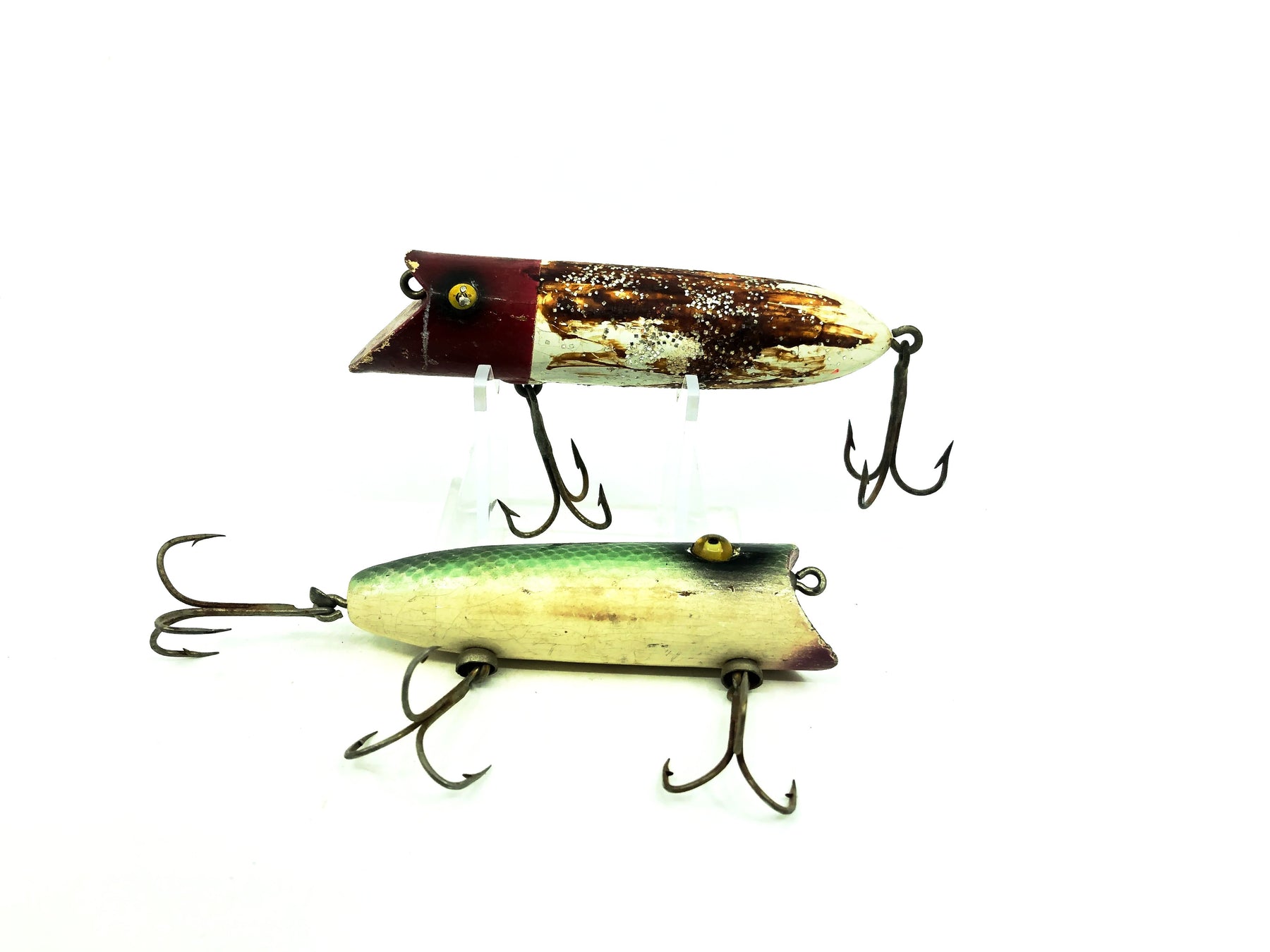 Lucky 13 Type Lure Combo. This pack includes two Lucky 13 type lures of unknown make or model. Both lures are used wooden baits with wear and one has some paint covering a good portion of its body. Fish or collect, see photos.  Fix up and take back out fishing or display as vintage warriors.