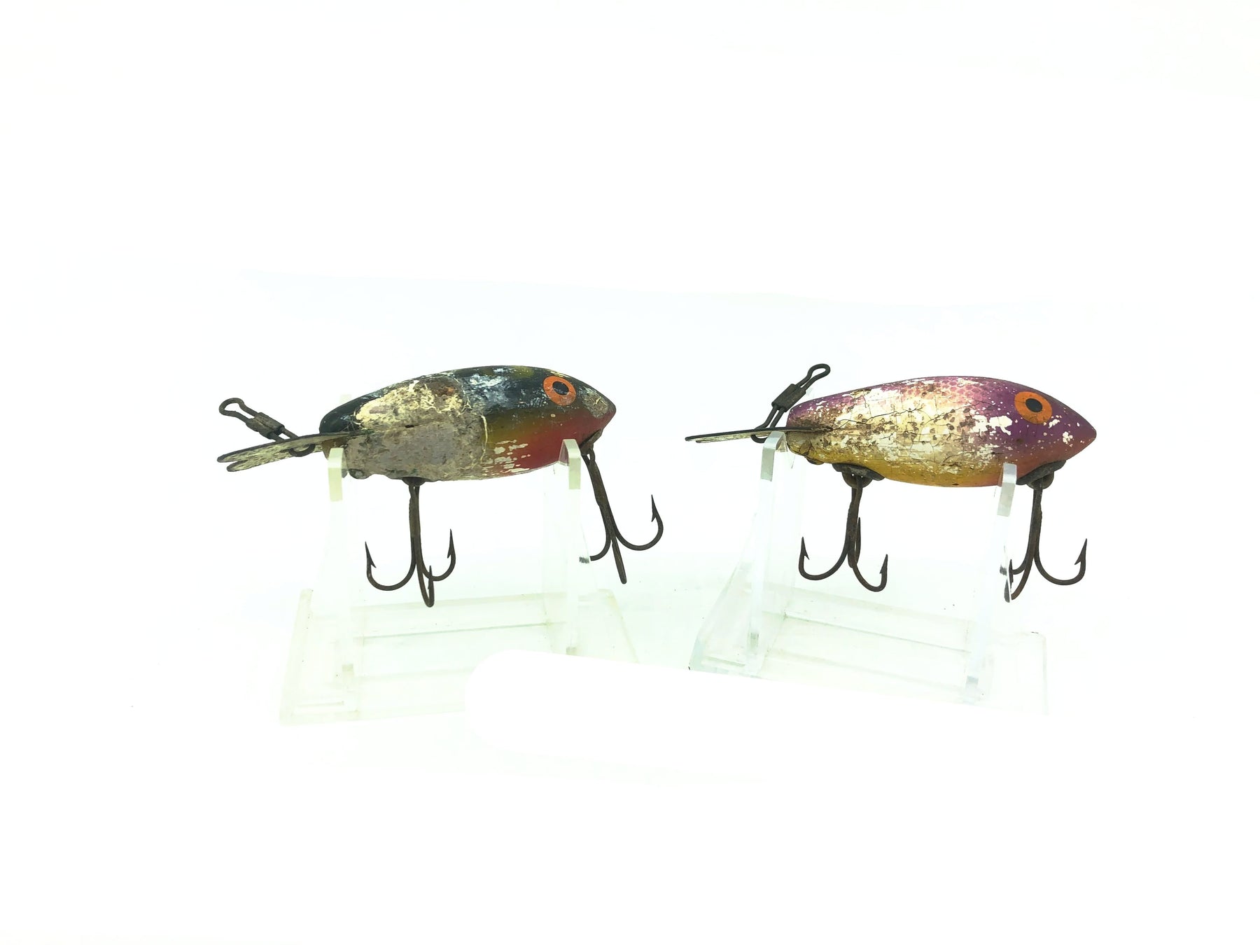 Wooden Bomber 300 Series Combo, #71 Purple Back/Yellow Belly/Silver Sparkles/#11 Frog Color. About 2 3/4" long these Bombers are in rough condition with wear as shown. Both lures also have some missing paint. Classic lure that isn't made anymore fish or collect. See photos. Fix these guys up and take back out fishing or display as vintage warrior baits. Priced to move.