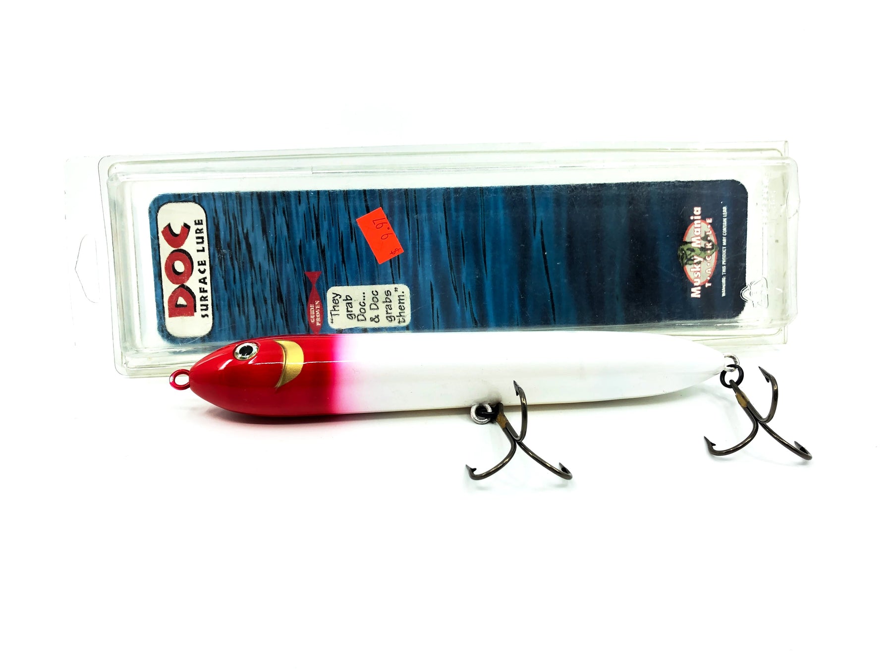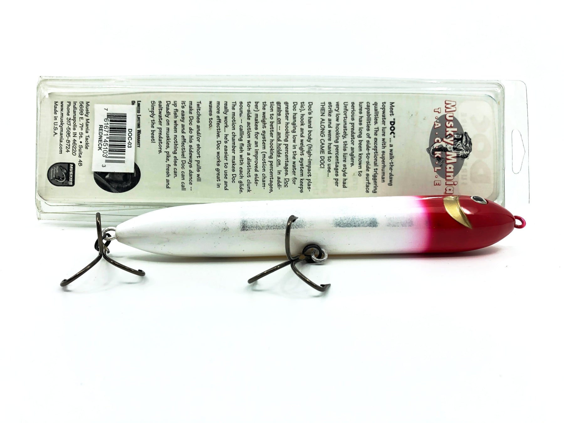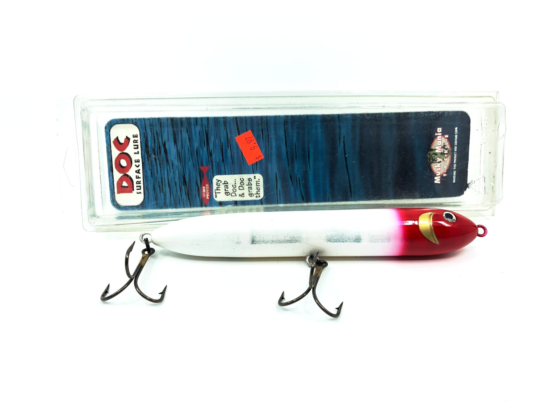 Musky Mania Doc Surface Lure, Red/White Color with Box. Model Doc-03. Body is about 8 1/4" long. Lure is new in box but has some box wear and scuffs (will probably clean off). Packaging has some minor wear, but otherwise good condition. Fish or collect. See photos.