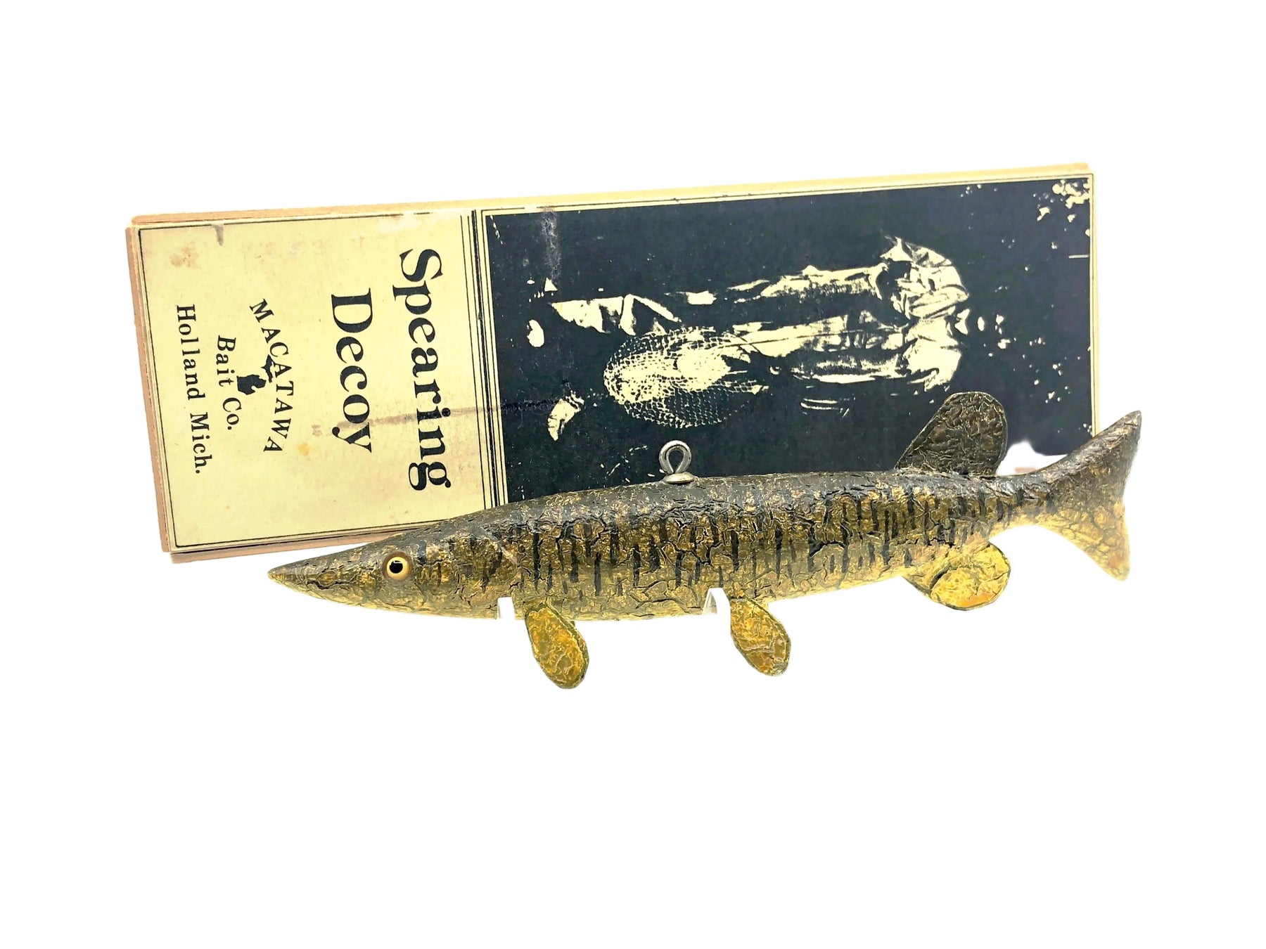 Macatawa Bait Co. Early Tiger Musky Spearing Decoy w/Box. Very early Macatawa bait and box here. This decoy is about 6 1/8" long overall. This decoy has some minor marks and a good amount of cracks in the paint (or that is the style it was done) from years of storage. Box is in good condition as well with one corner having it's adhesive undone. See photos. Glass eyes.