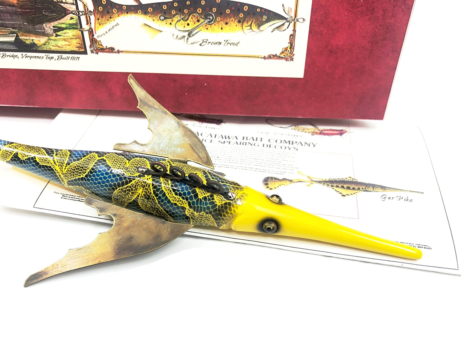 Macatawa Bait Co. Yellow/Black/Blue Scale Gar Decoy w/Box. Uncommon style from Macatawa Baits, unsure what color this decoy is. This set comes with the classic Macatawa order sheet. Decoy is about 8 1/2" long, just the body, about 10" overall. Wooden decoy, glass eyes and metal wings. Decoy and box are in good condition with just a little storage wear on the box. See photos.