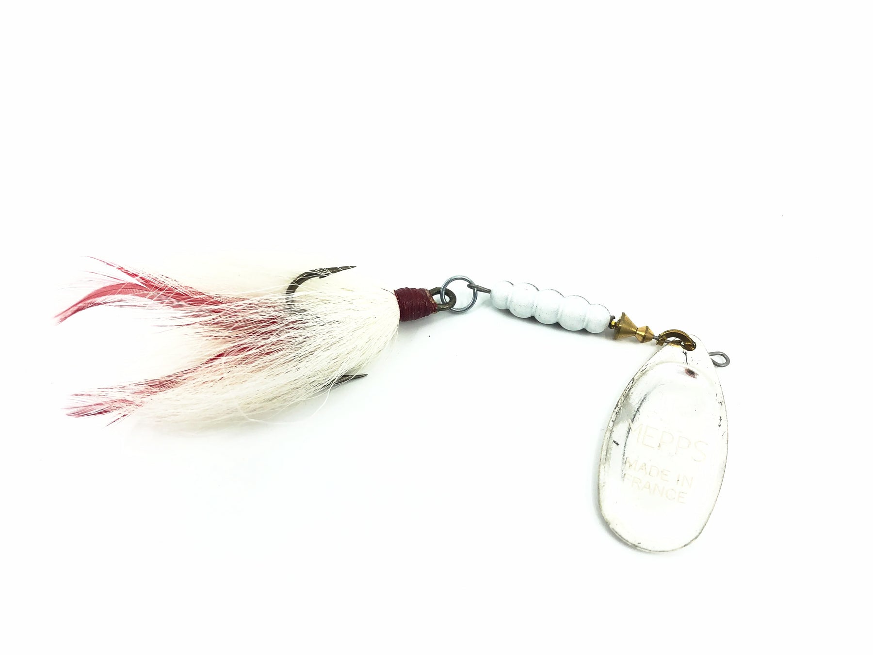 Mepps Magnum Musky Killer, Silver Blade/White & Red Bucktail Color. This classic spinner is about 5 1/8" long excluding the bucktail. Spinner is in good condition with some minor wear and chips. Fish or collect, see photos.