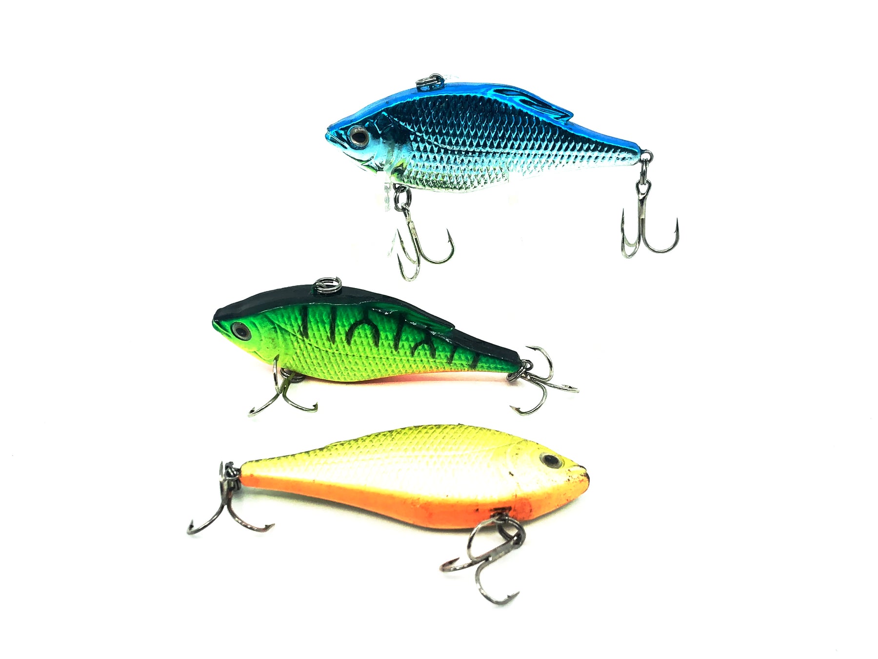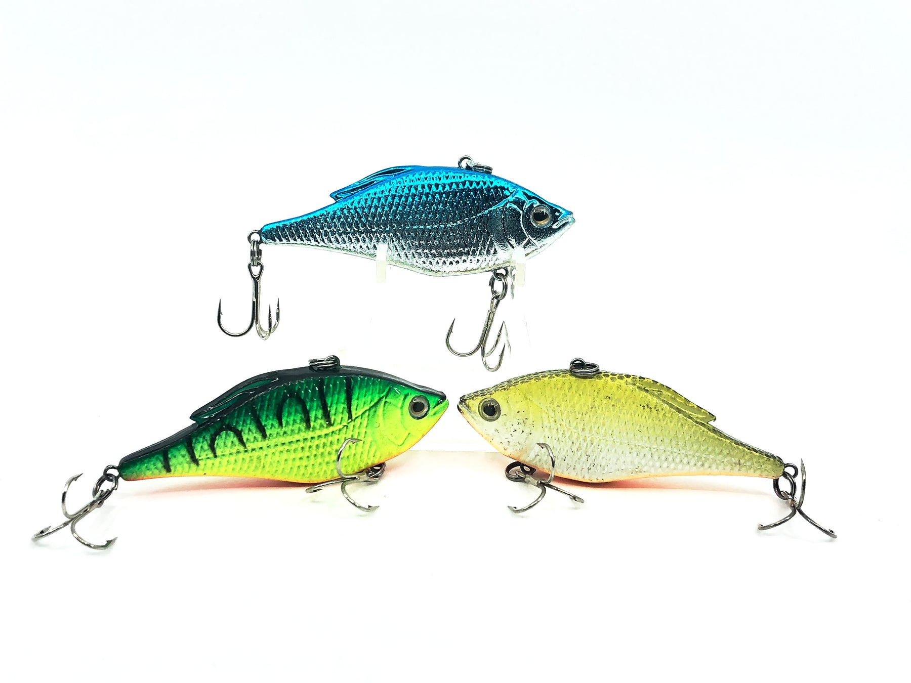 Lipless Crankbait Trio. Great pack here with lures all from the same unknown company. Lures are all about 2 7/8" long. These baits are used with some minor wear and marks but in overall good condition. See photos.