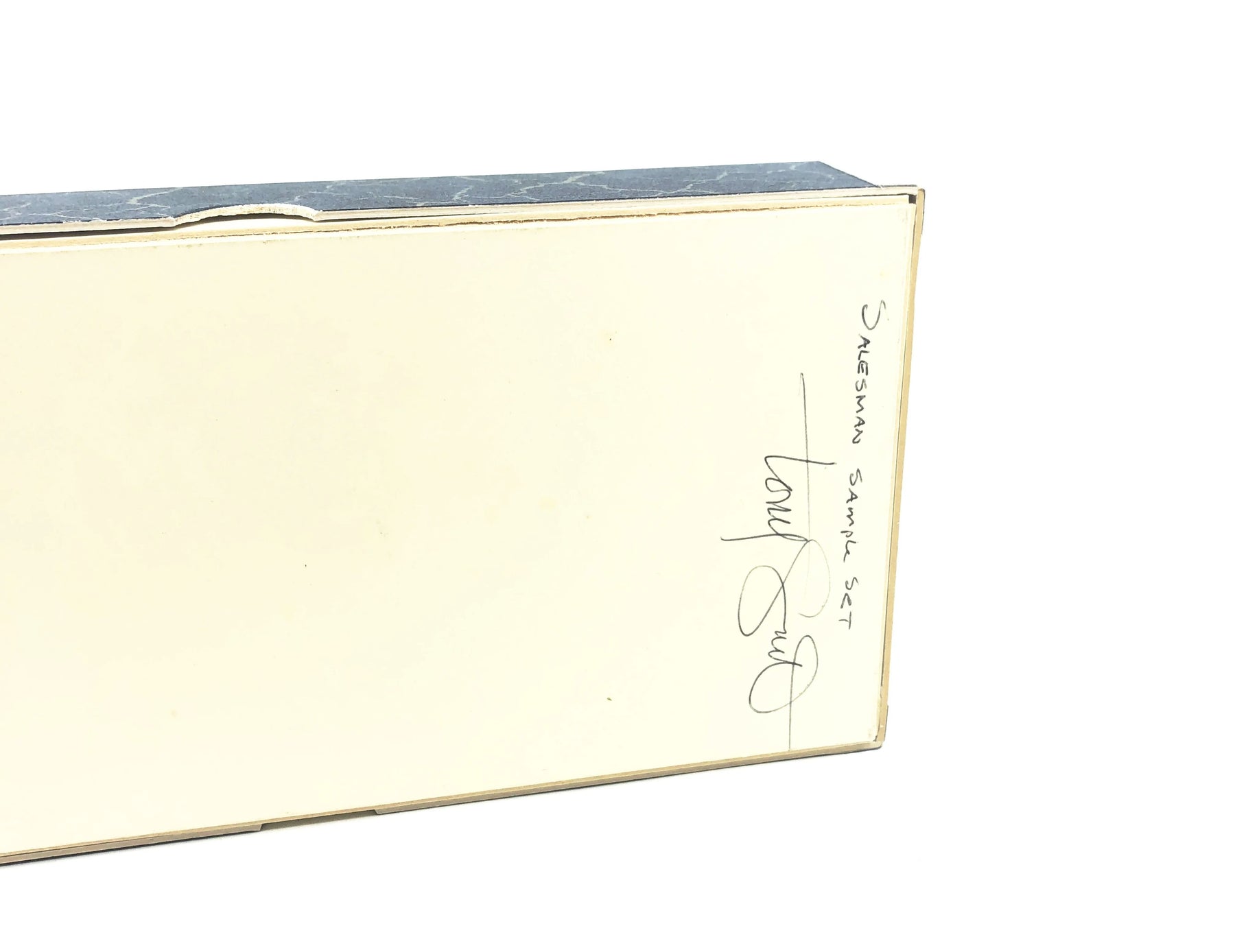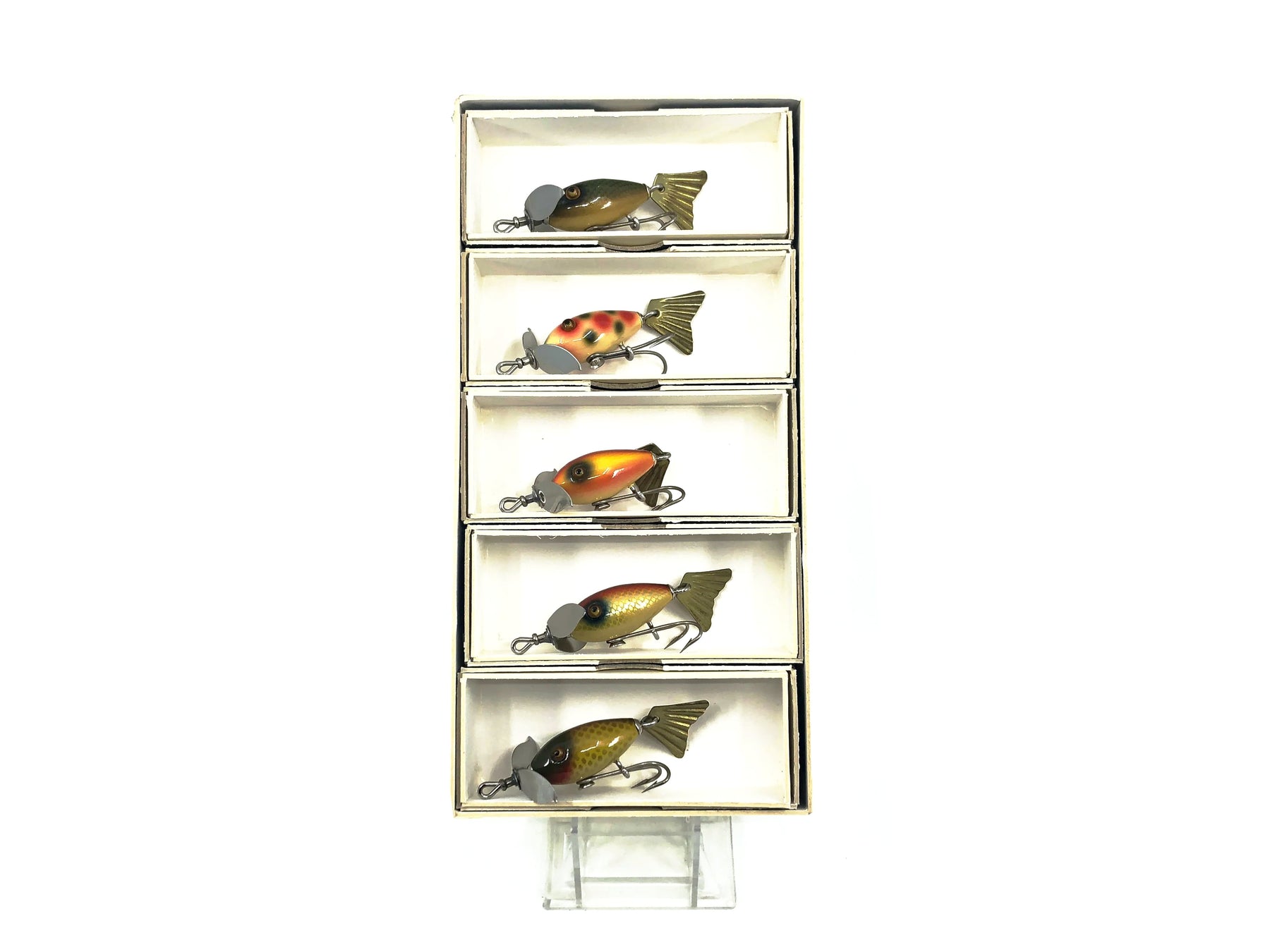 Macatawa Bait Co. Salesman Sample Set of 5, Flyrod Wagtail Minnows. Alone these Wagtail Minnows are some of Tony's more uncommon lures. But as a signed Salesman Set this is quite a rare collectable. Each bait is painted in a different iconic Creek Chub color. The Wagtail Minnows are in great condition and the matching boxes in this set are also in good condition. Each bait is about 1 1/2" long (body only--3" overall). See photos.