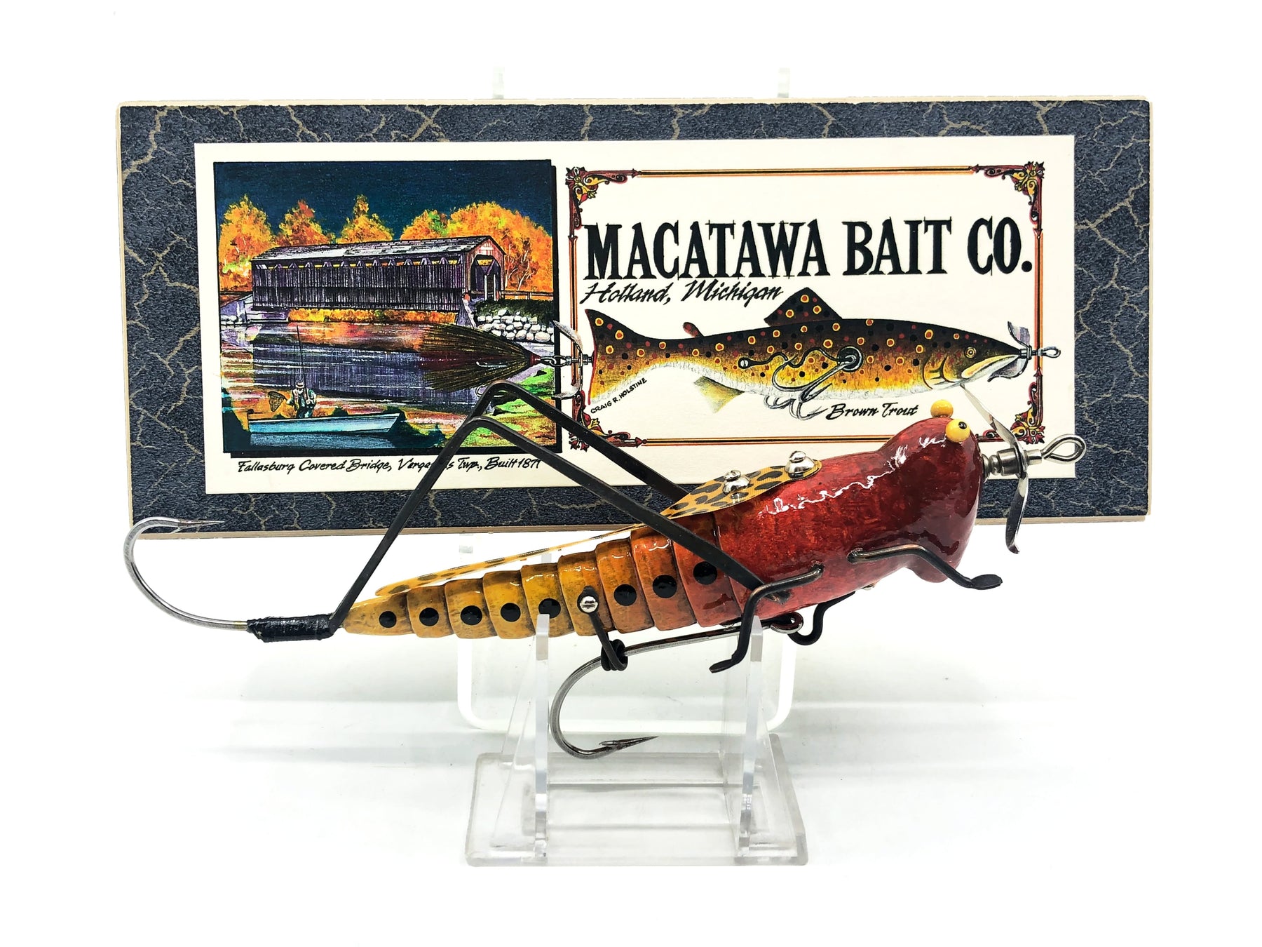Macatawa Bait Co. Large Muskie Grasshopper Lure w/Box. Older and classic Macatawa model that comes right off the page of the old Macatawa Bait Co. Order sheet. Lure is about 7 1/4" long from back hook to line tie (about 5" body). Wooden lure, glass eyes and metal legs. Lure and box are in amazing shape with just a little storage wear on the box. See photos.