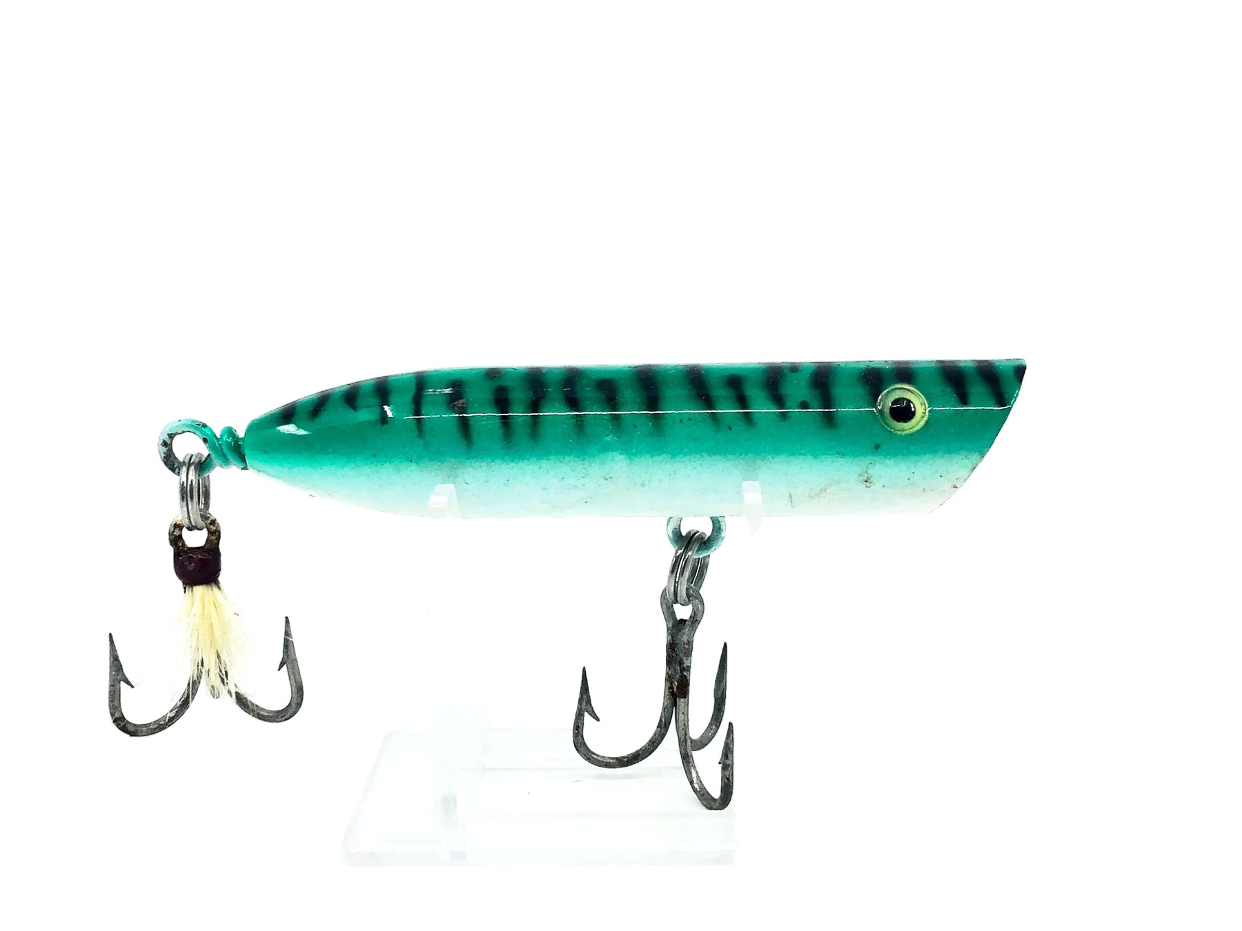 Mackerel Pencil Popper. Unknown brand on this used pencil popper. About 4 1/8" long. Lure has some wear and marks but is in overall good condition. Fish or collect, see photos.