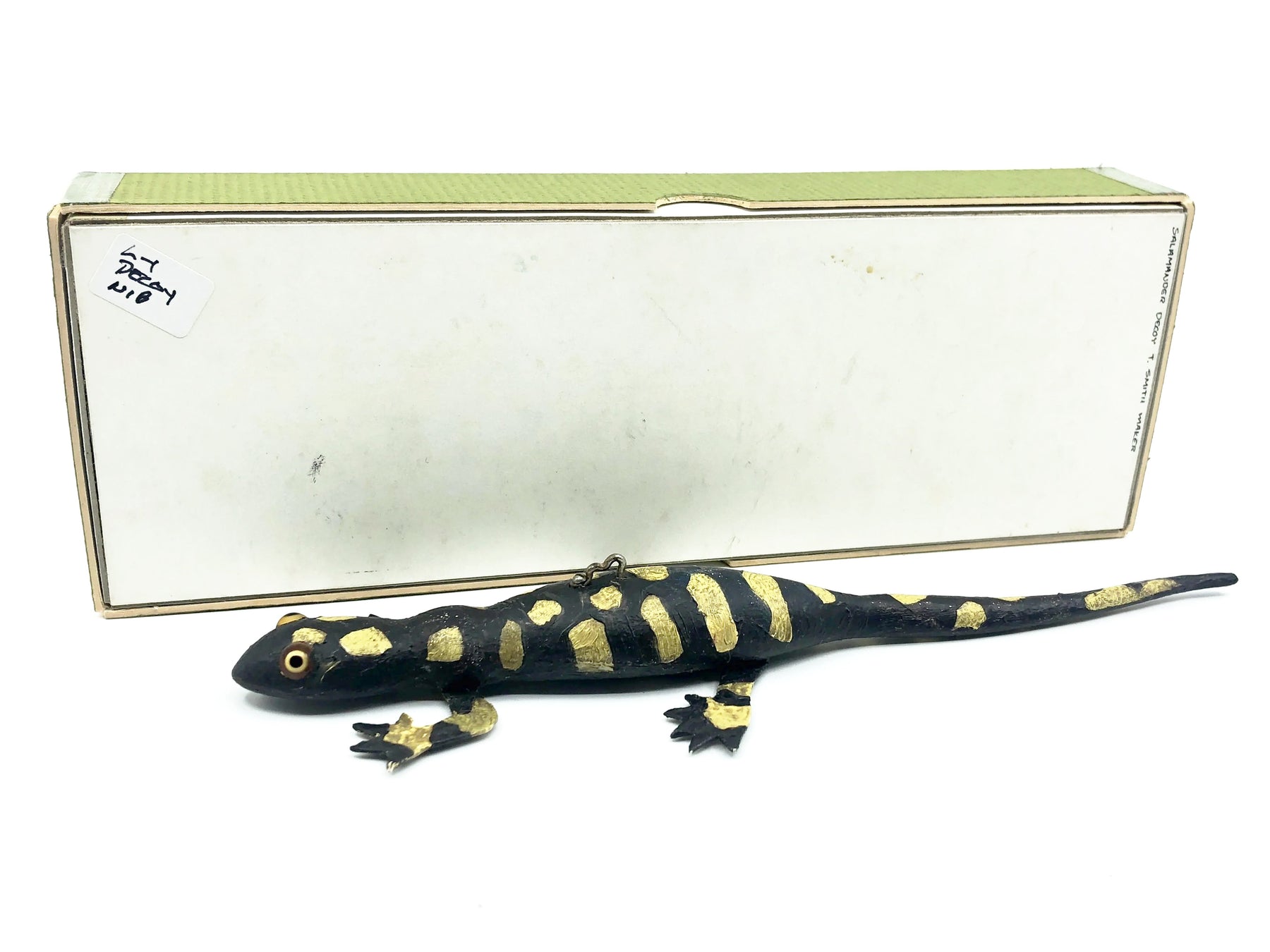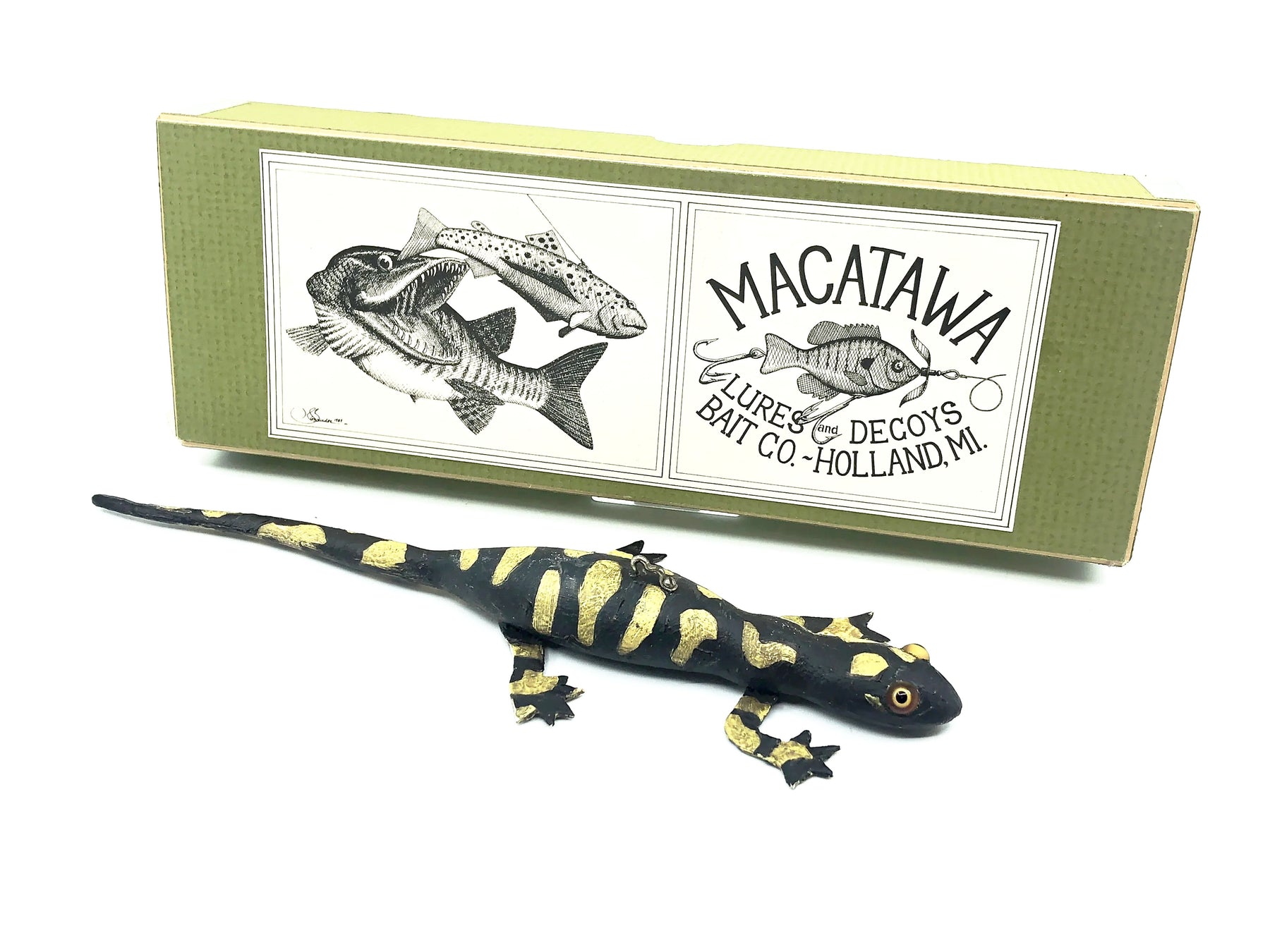 Macatawa Bait Co. Tiger Salamander Decoy w/Box. This is an early box and decoy from Macatawa. One of his classic earlier decoy styles too! This decoy is about 8 3/8" overall. Wooden decoy, glass eyes and metal feet. Decoy is in amazing shape. The box has a slightly loose side with the corner tape loose and some minor wear. See photos.