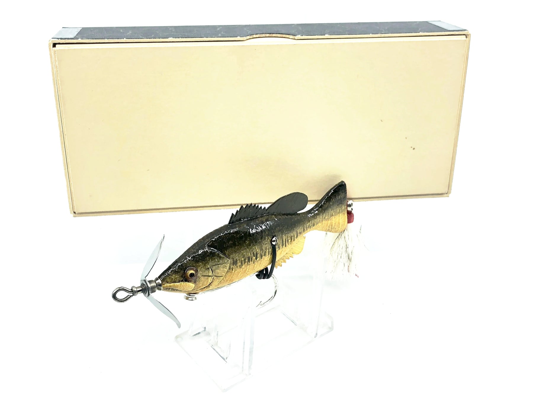 Macatawa Bait Co. Large Mouth Bass Lure w/Box. Early Macatawa lure and a piece of paper included with the box states: "Early Macatawa Large Mouth Bass, 1 of 3 ever made" (maybe marked by Tony or a collector). I will include this in the box. Lure is about 4" long excluding the spinner. Wooden lure, glass eyes. Lure and box are in amazing shape with just a little storage wear on the box. See photos.