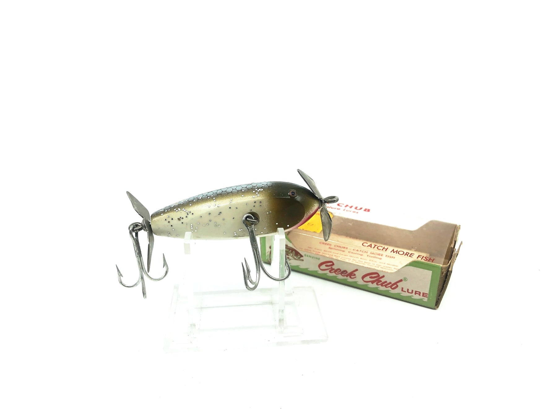 Creek Chub Baby Injured Minnow in Silver Flitter Color with Box. Great vintage Creek Chub lure here. About 2 1/2" long. Correct box. Box has some wear but lure is great, see photos. One of the all-time classic fishing lures.