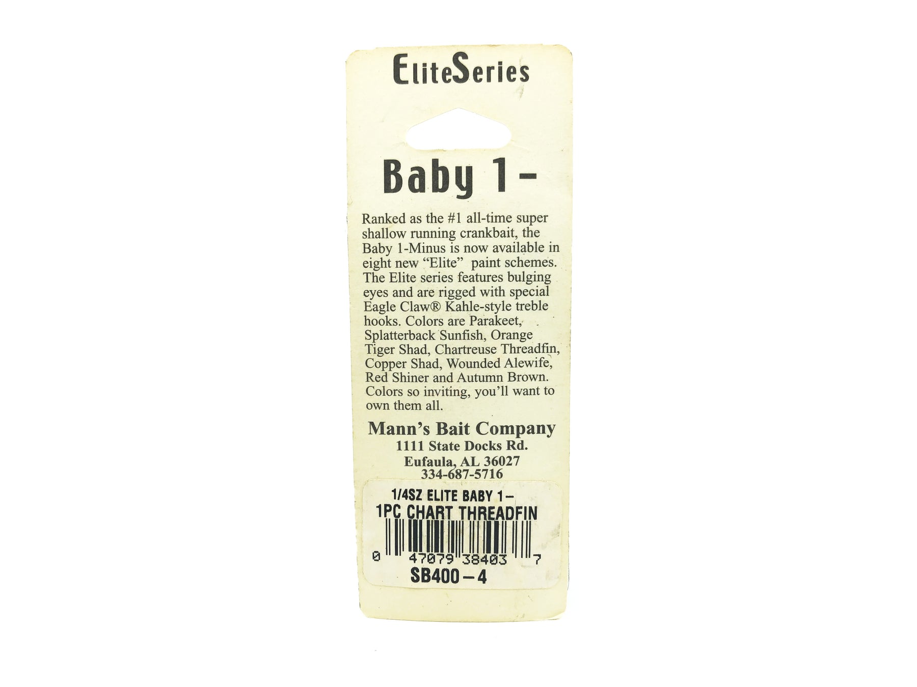 Mann's Elite Baby 1- Minus, Chartreuse Threadfin Color on Card. These lures are insanely desirable ever since Mann's closed their doors. Bait has about 2 1/4" long body and weighs 1/4oz. Bait is new on card, card's bubble has some dents but in overall good condition. See photos.