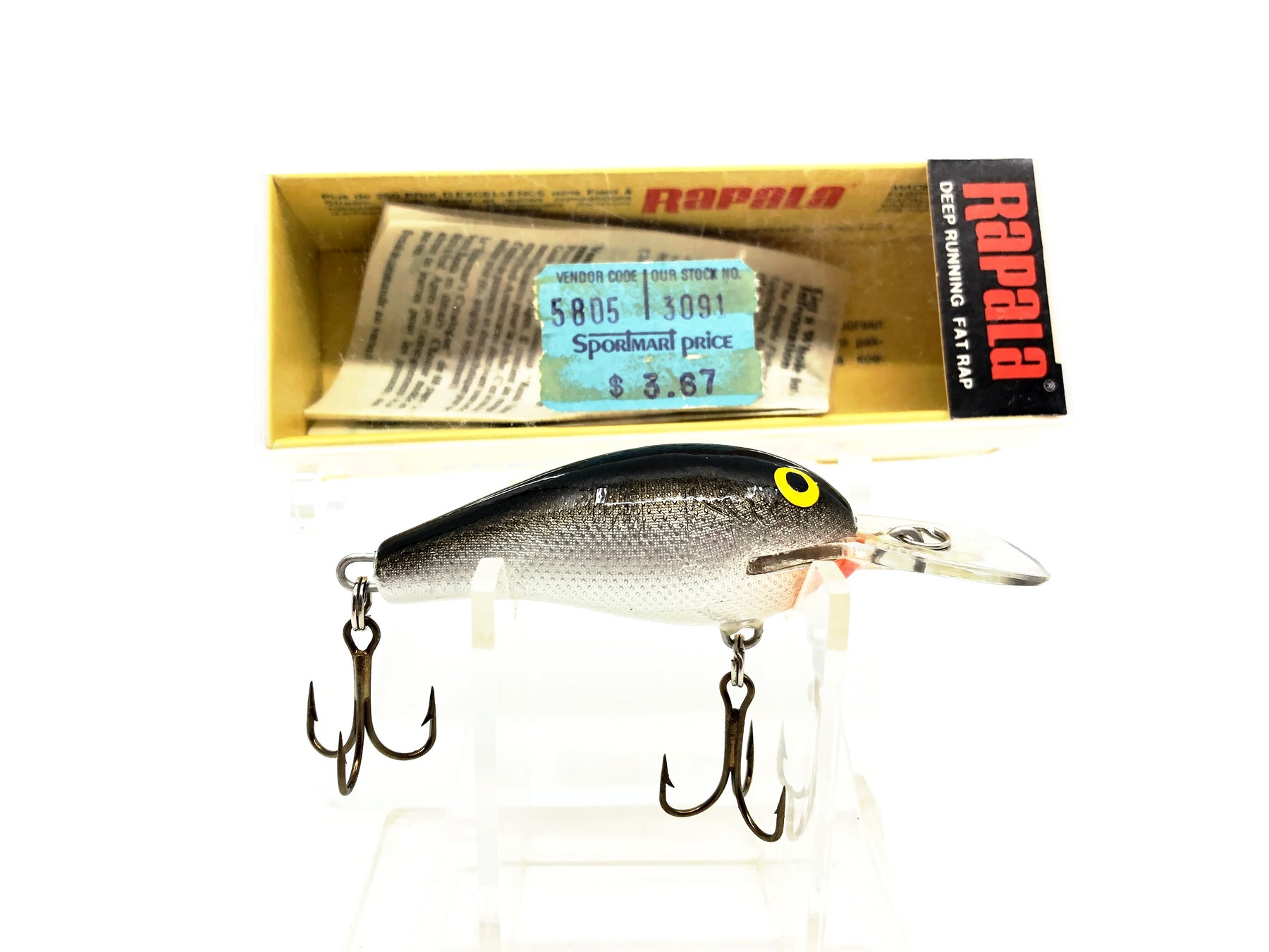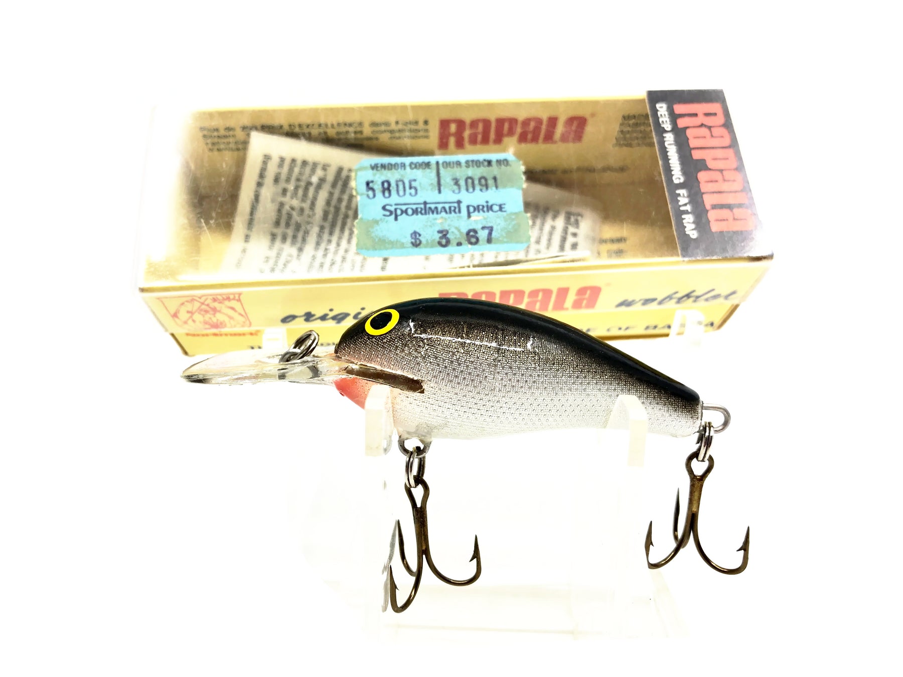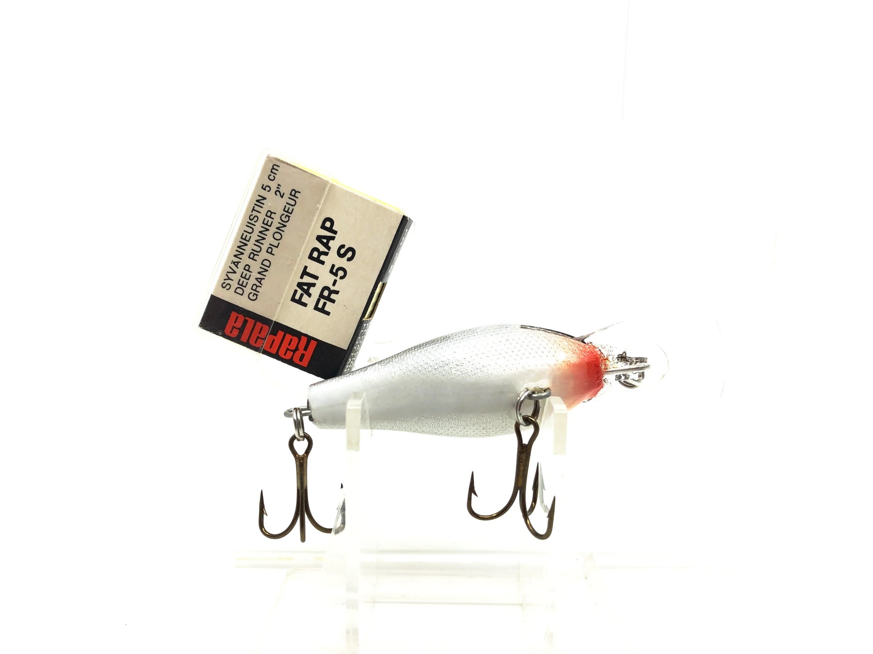 Rapala Fat Rap FR-5, S Silver Color. About 3" long including lip. This lure is in new condition with some minor wear from storage. Box has some minor wear as well. Perfect to fish or collect. See photos.  Very desirable color and lure for Rapala.
