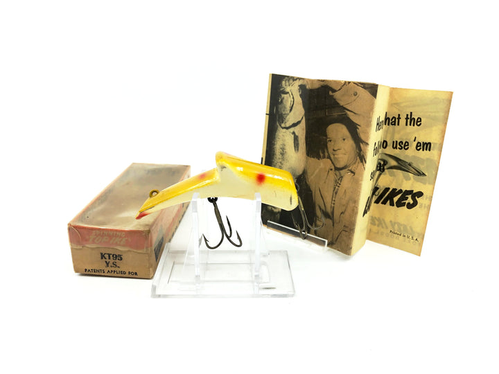 Kautzky Wooden Spinning Top Ike with Box and Insert Yellow Spots Color. About 2 7/8" long. Box has some wear and fading from age but overall in ok condition. Lure has some residue on it, aside from that in good condition. These spinning Top Ikes are very hard to find. Wooden Kautzky Lazy Ike Top Ike lure dating to probably around 1954. Grab this combo while you can.