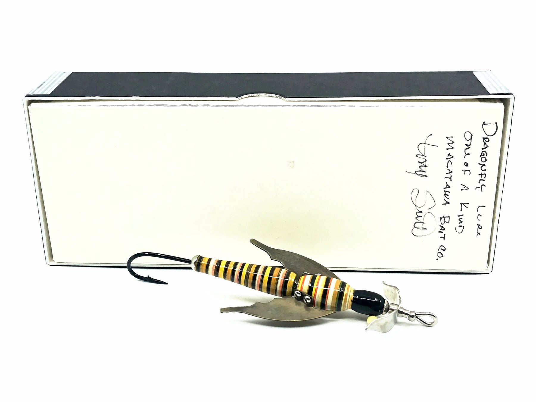 Macatawa Bait Co. Dragonfly Lure w/Box - Signed 1 of 1. Great Macatawa bait here, signed by Tony Smith on the box. About 5" long overall, 3" body only. Lure is in great condition. Box in good condition with a little storage wear. See photos.