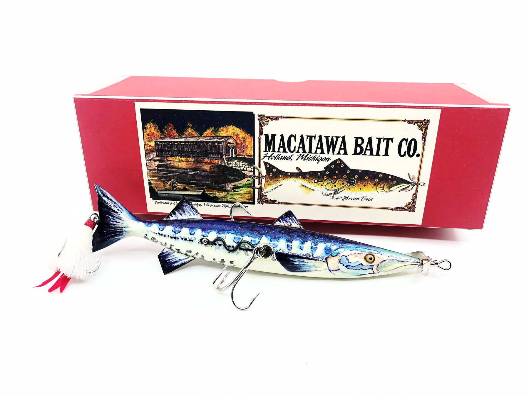 Macatawa Bait Co. Great Barracuda Minnow 8" Lure w/Box. Newer Macatawa bait here. Lure is about 8" long excluding the spinner. Wooden lure, glass eyes. Lure and box are in amazing shape with just a little storage wear on the box. See photos.