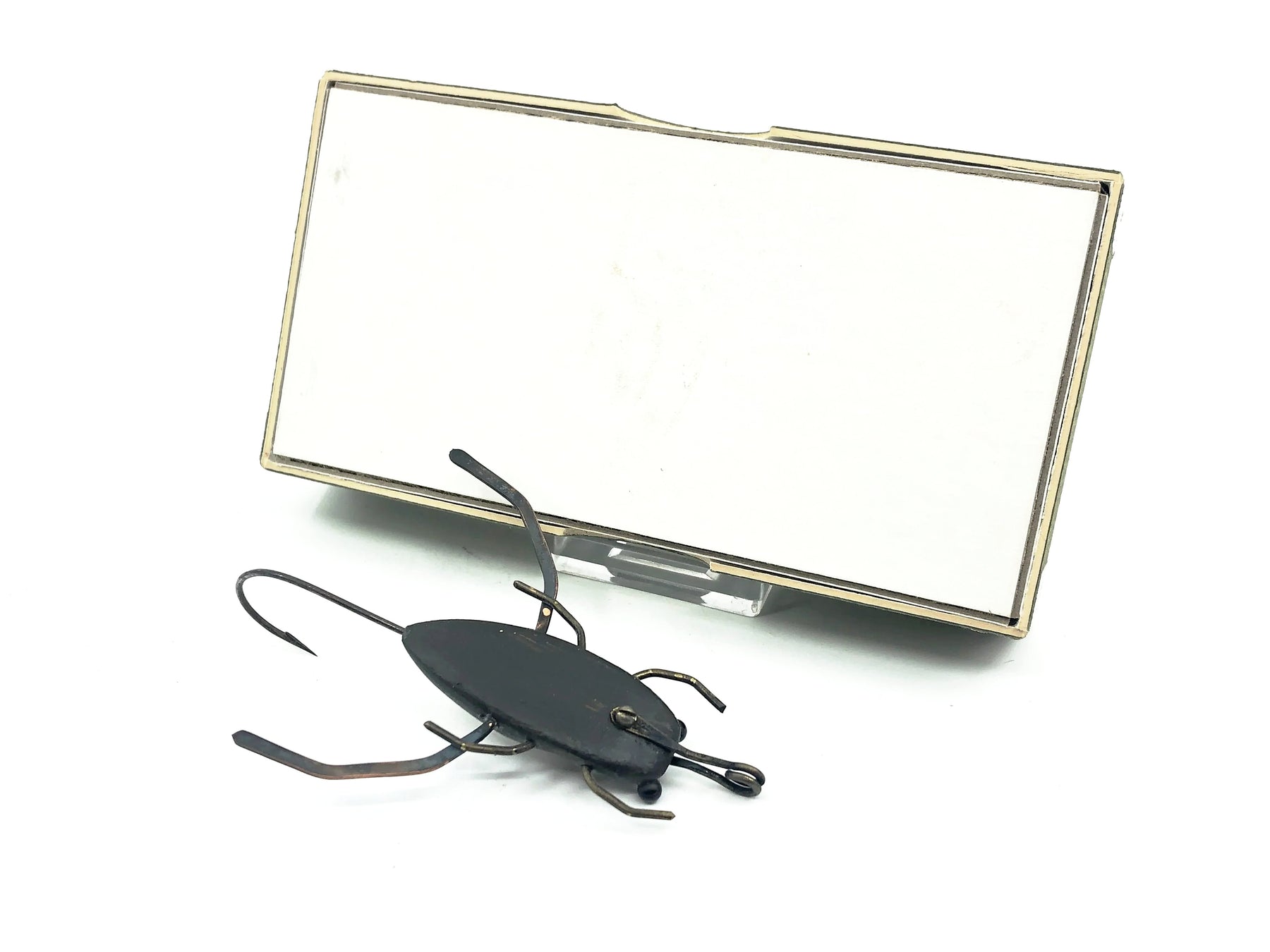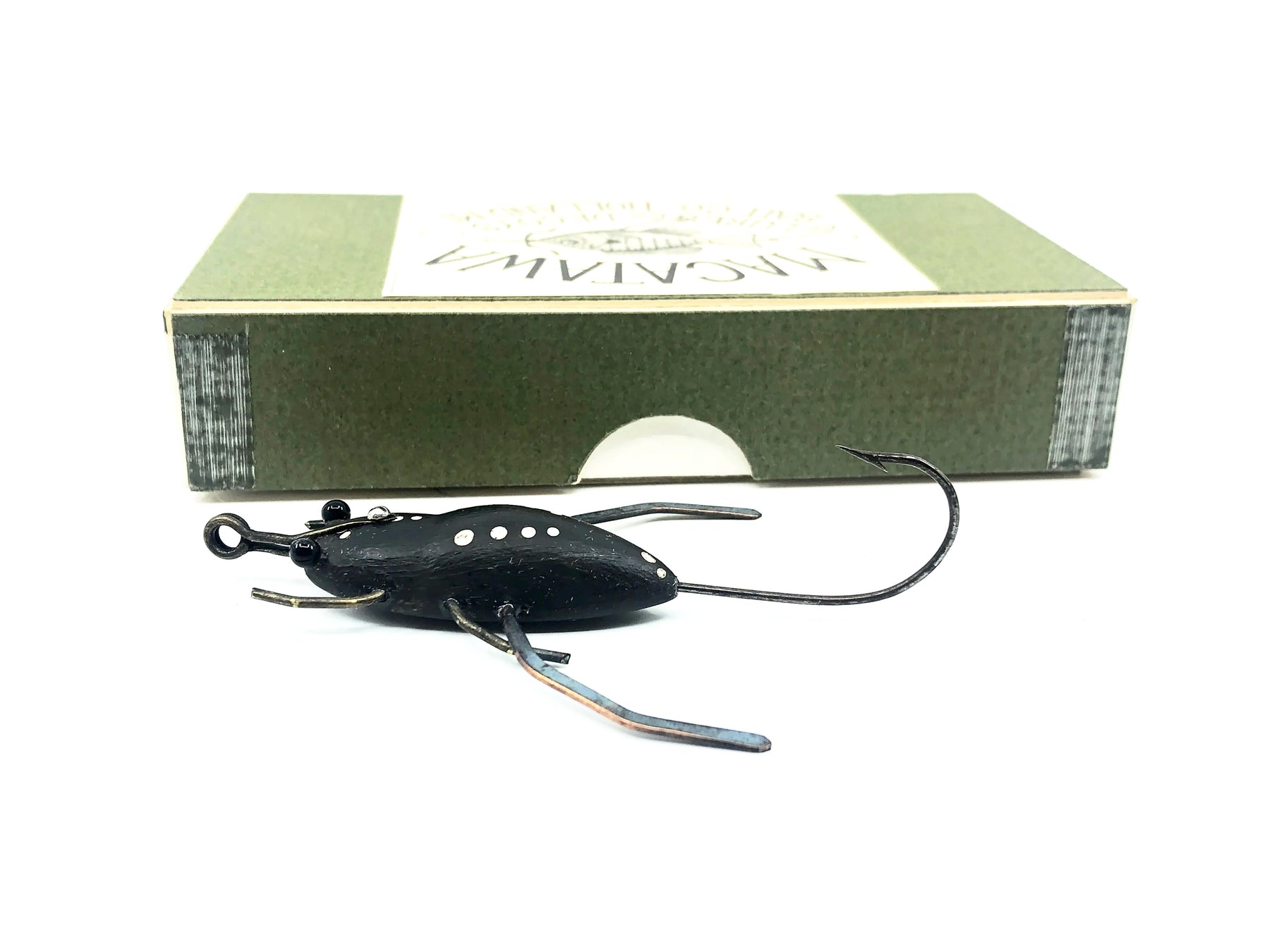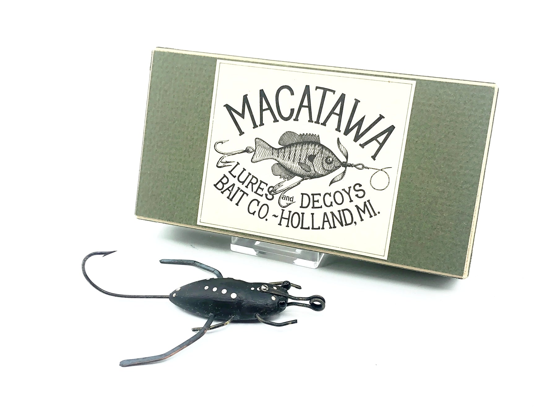 Macatawa Beetle, Water Bug w/Box. Very new Macatawa bait here. About 3 1/2" long including the back hook and front line tie (1 3/4" long body). Wooden lure with metal works. Lure is in amazing shape. The matching box is in great condition as well with just a little minor storage wear. See photos.