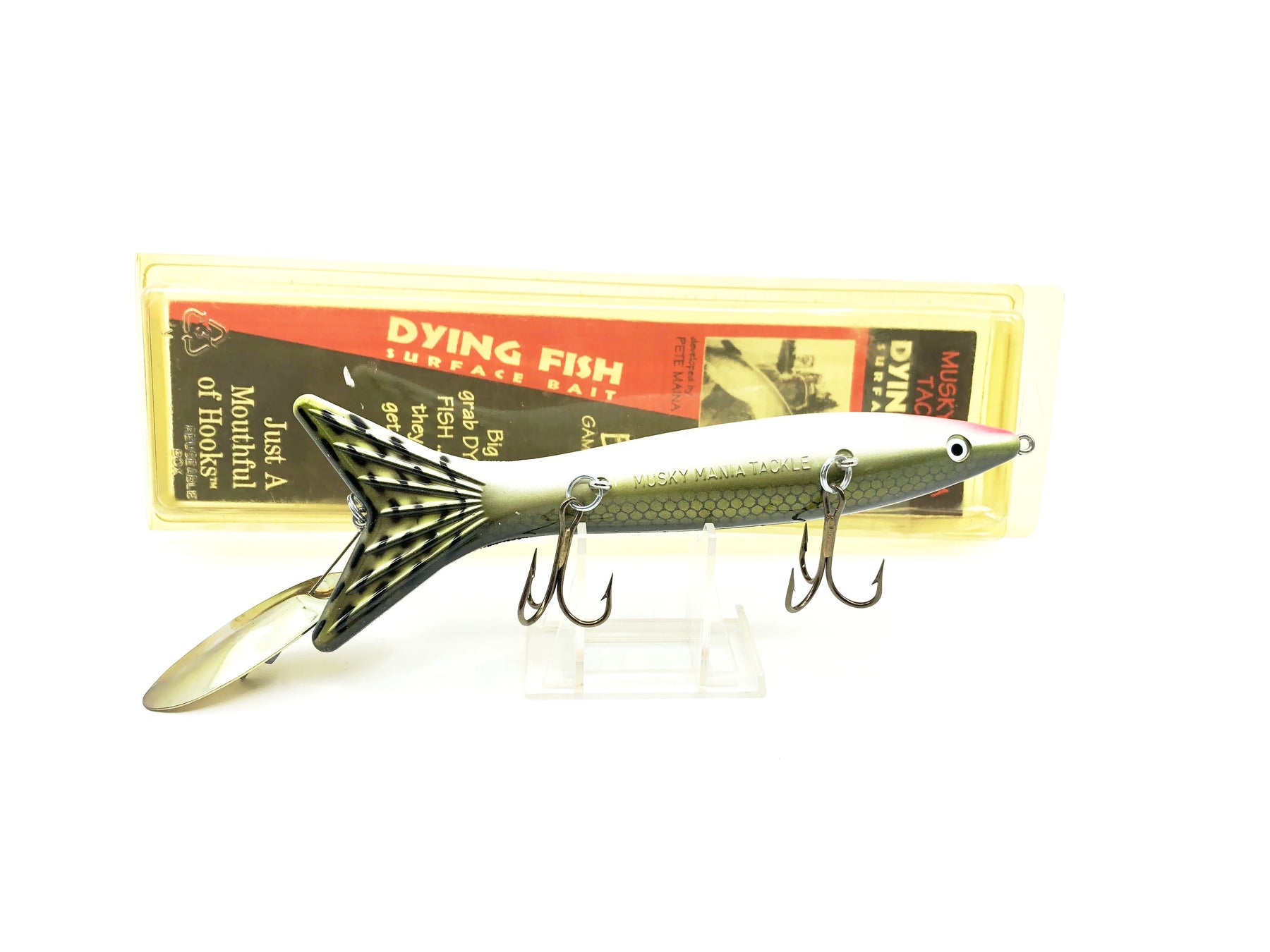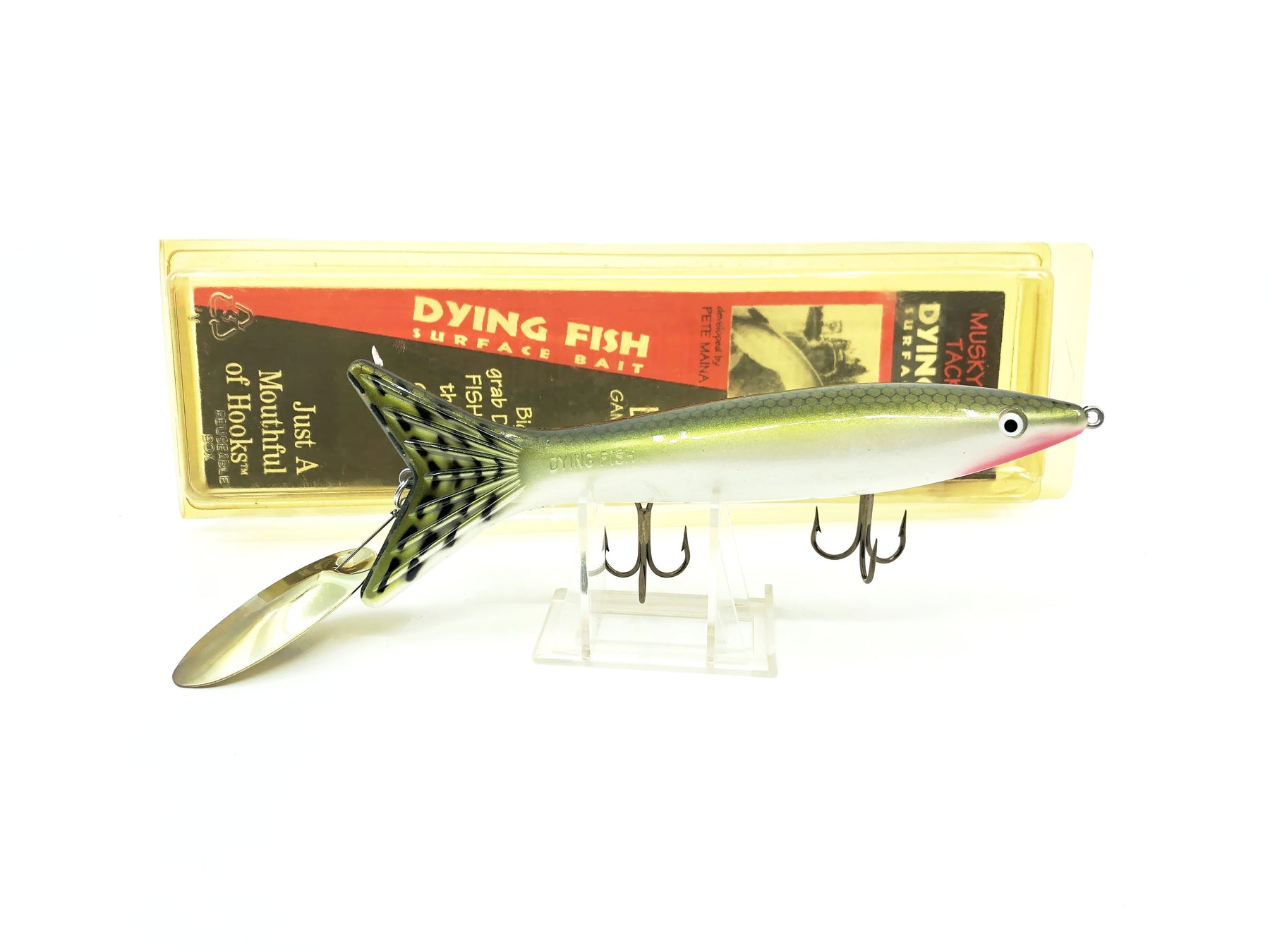 Musky Mania Dying Fish Surface Bait, Tennessee Shad Color with Box. Model DF-18. Earlier Musky Mania Tackle lure here. About 7 1/2" long. Lure is in great condition. Packaging has some wear and uv fading, but otherwise good condition. Fish or collect. See photos.