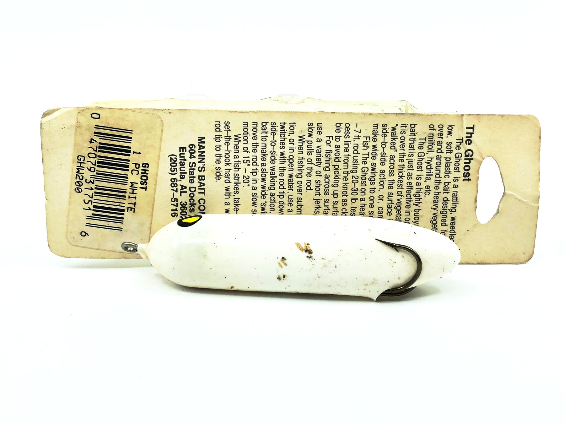 Mann's Ghost Weedless Soft Bait, White Color with Card. About 3 3/4" long body. This Mann's soft bait has some wearr and residue from storage, however still in good condition. The card has a good amount of wear and the card is loose. This discontinued lure would perfect in your tackle box or collection. See photos.