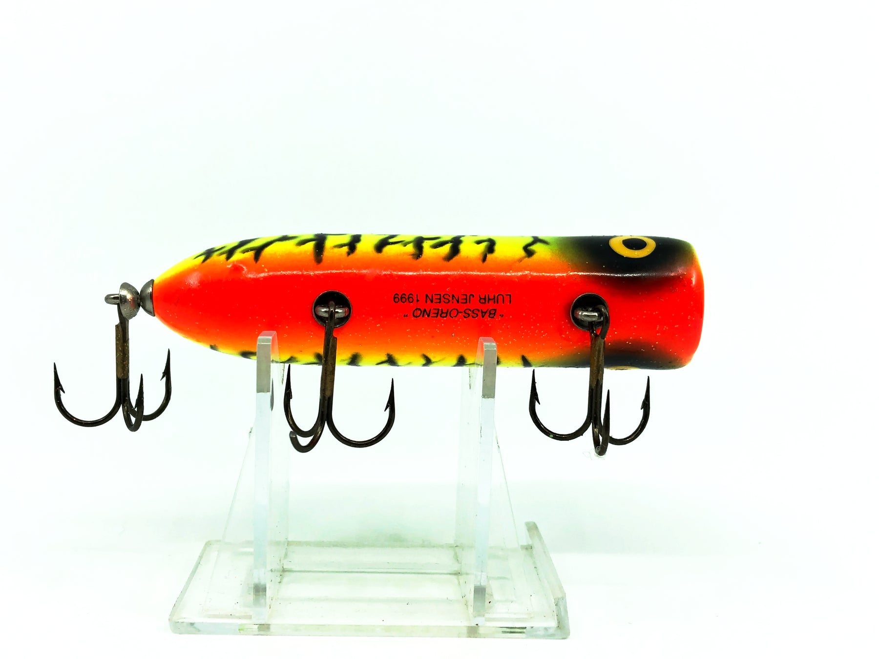 Luhr-Jensen South Bend Original Bass-Oreno 1999, Firetiger Color. About 3 3/4" long. Lure is used with some minor wear and a broken barb but in overall good condition. One of the greatest fishing lures ever made. Fish or collect you can't go wrong on this one. See photos. One of the all time classic baits in wood.