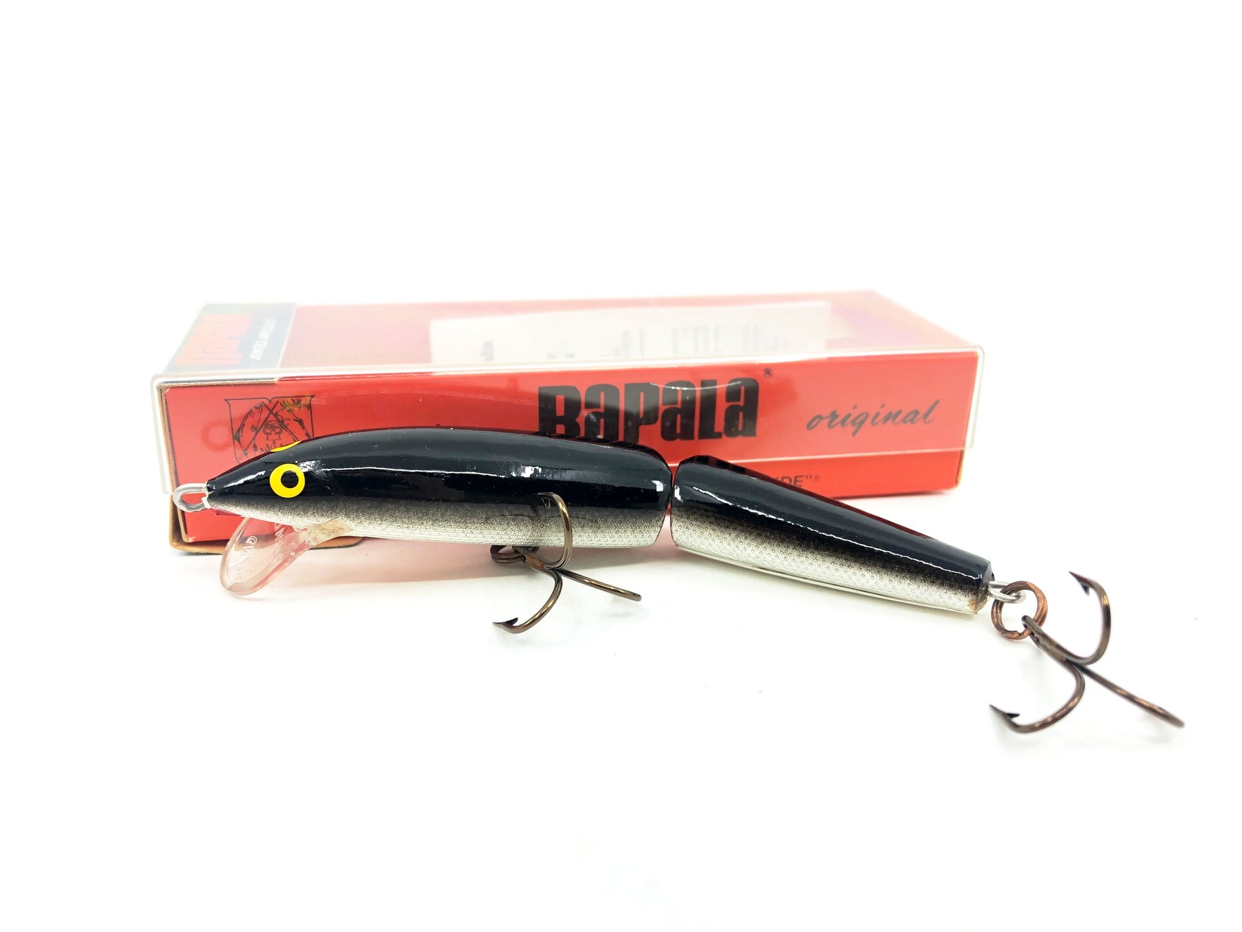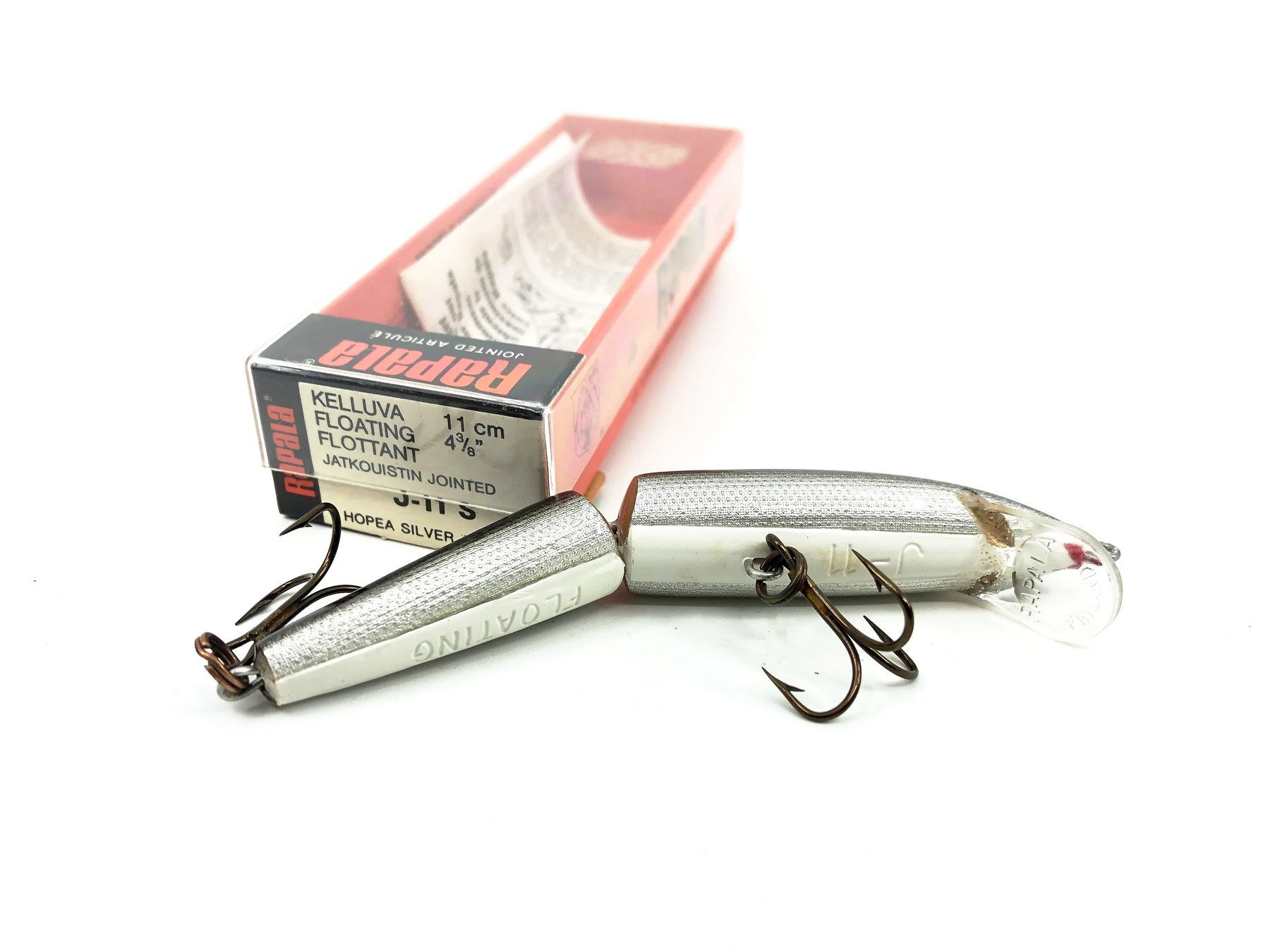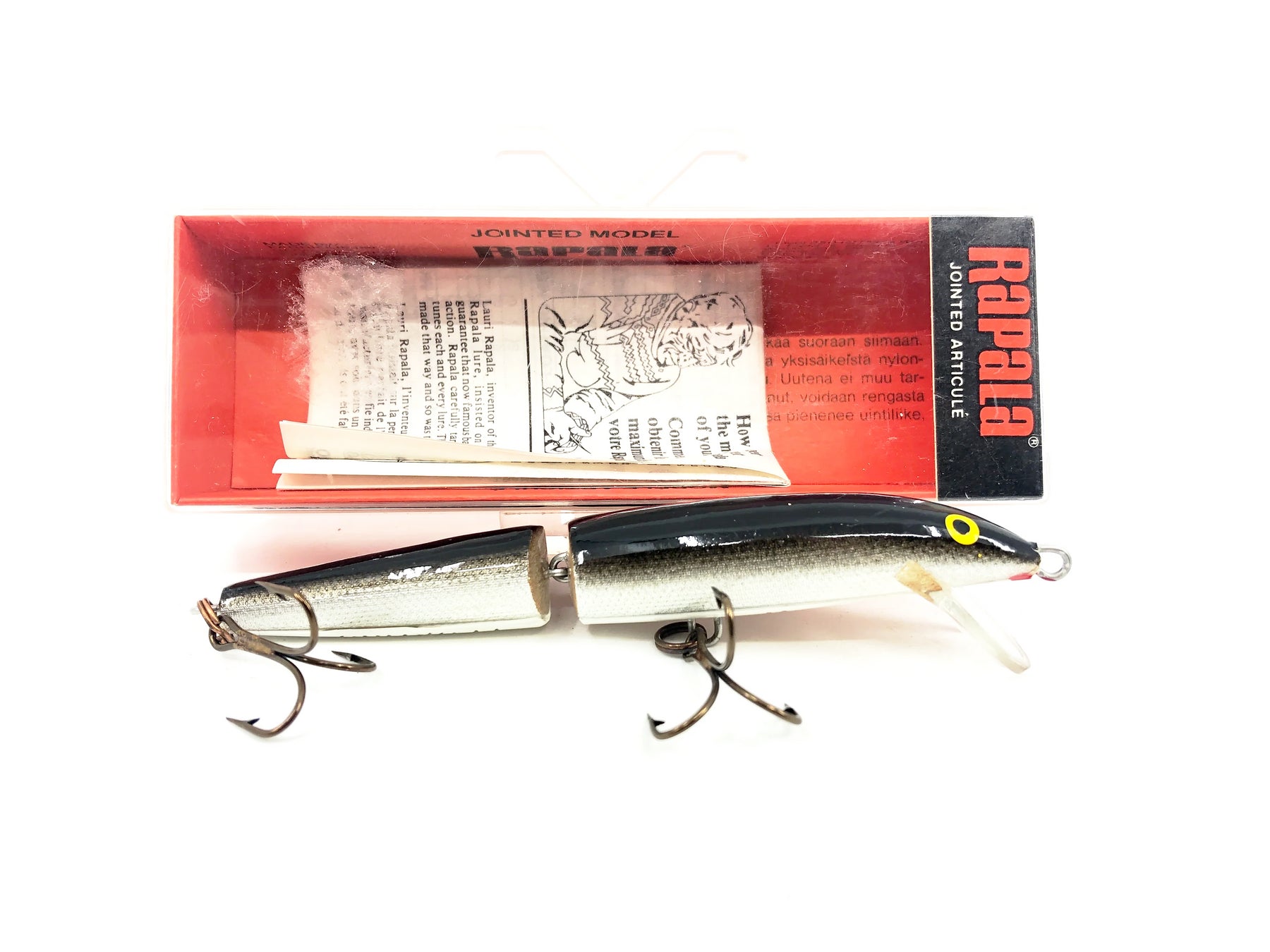 Rapala Jointed Floating Minnow J-9, S Silver Color w/Box. Good deal here on a vintage version of this lure. Lure is in new condition and the box is in great condition as well. Bait is about 3 1/2" long. Collect or fish classic Rapala lure.  See photos.