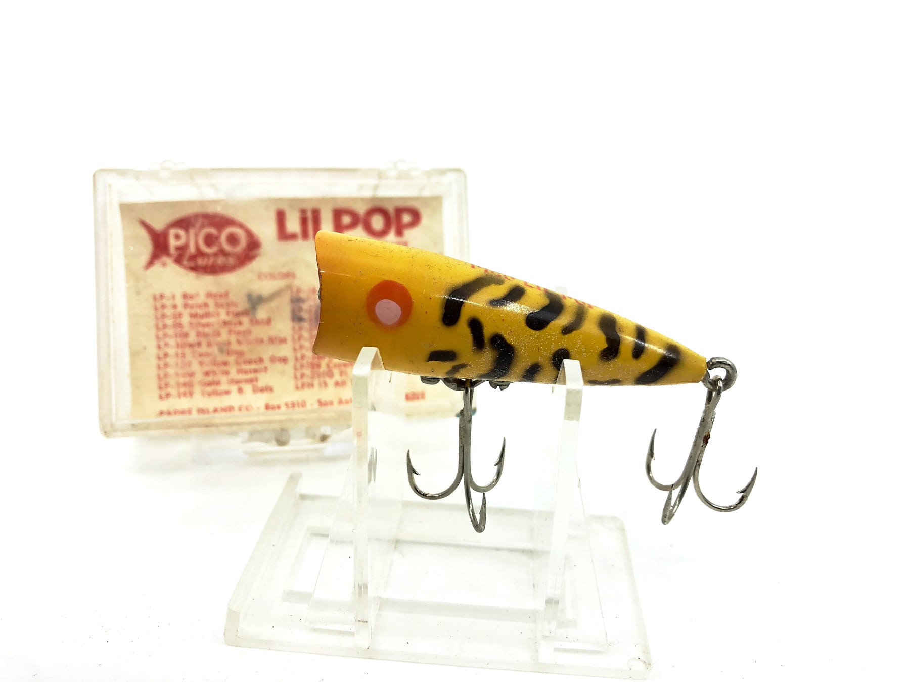 PICO Lil Pop, Yellow Coachdog Color with Box. Harder to find early plastic box. Lure is about 2 3/8" long. Lure has some minor wear and marks but in overall good condition. Box is in good condition as well. See photos.