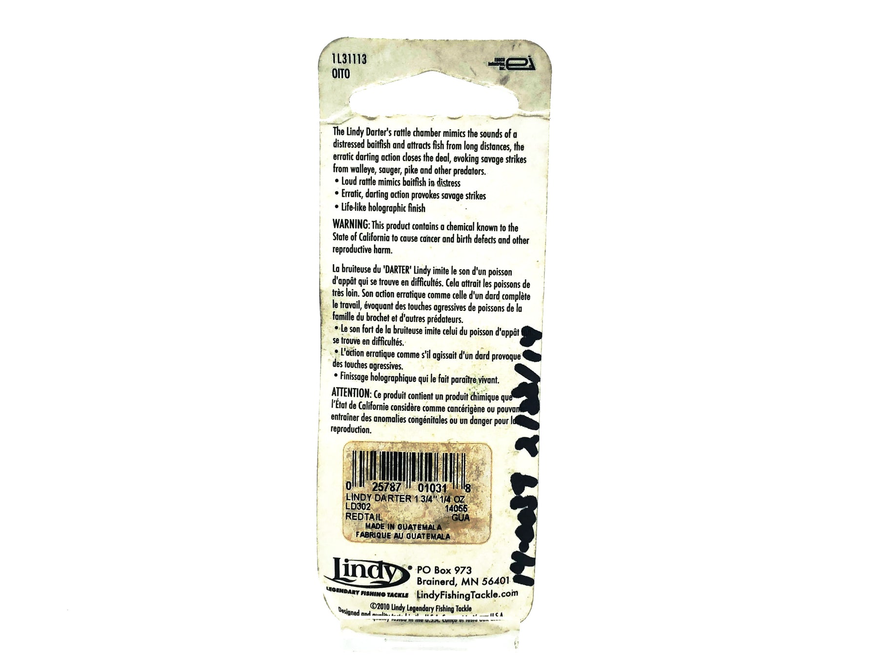 Lindy Darter 1/4oz, Redtail Color on Card. Lure is about 1 3/4" long. Card has some wear but overall in good condition, lure is new on card. Great deal here on a fantastic discontinued lure, see photos.
