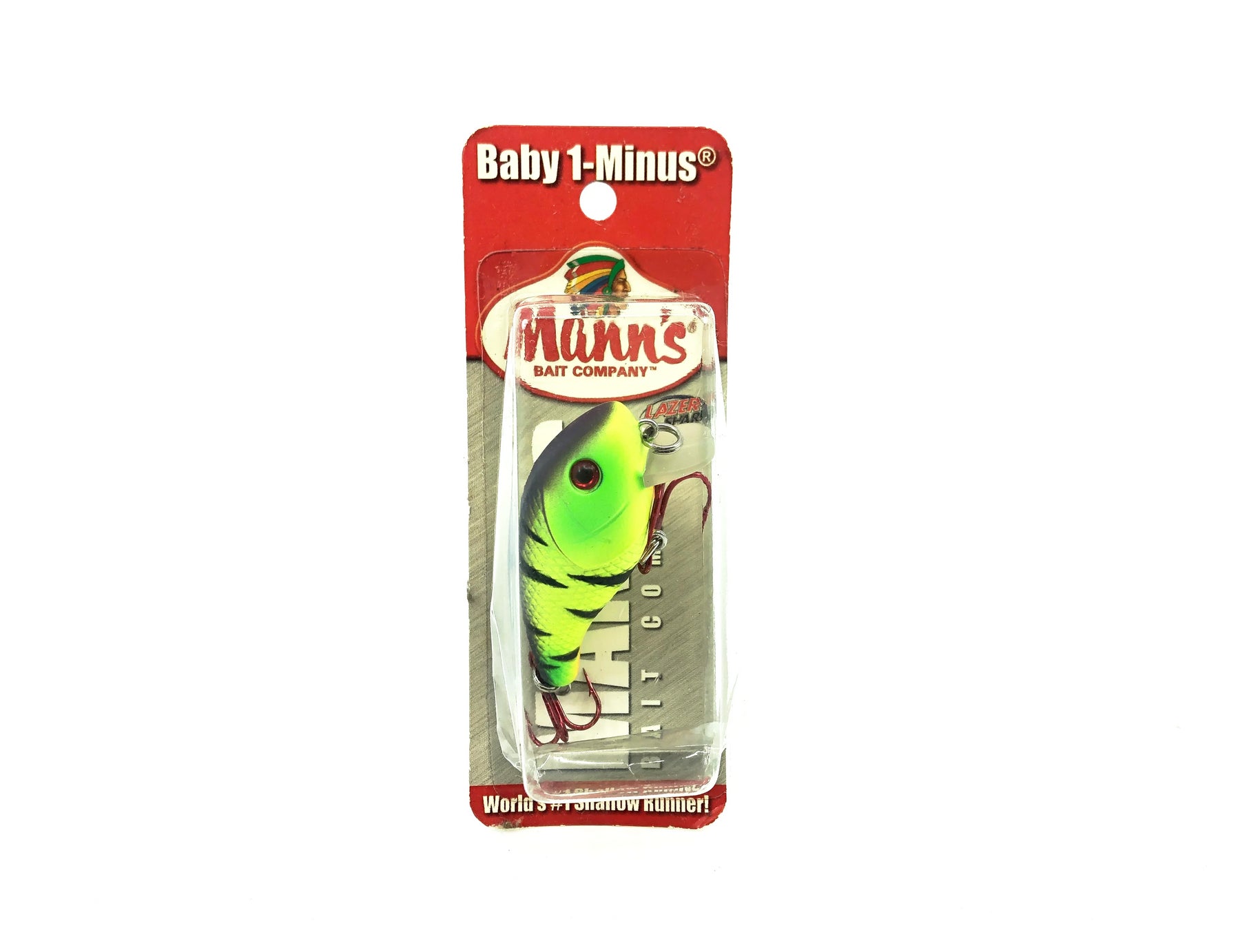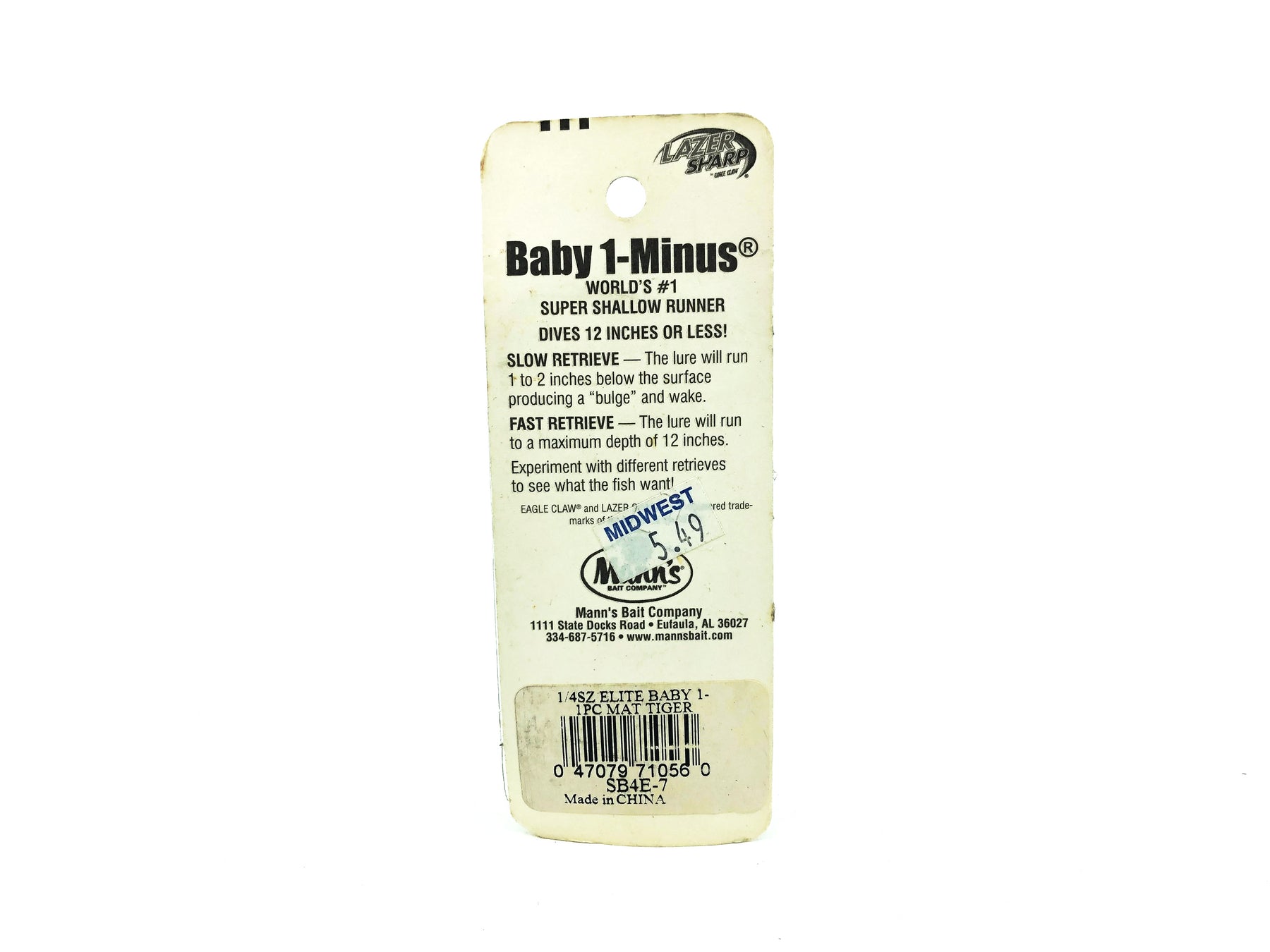 Mann's Elite Baby 1- Minus, Mat Tiger Color on Card. These lures are insanely desirable ever since Mann's closed their doors. Bait has about 2 1/4" long body and weighs 1/4oz. Bait is new on card. Card is in good condition with some minor wear and dents. See photos.