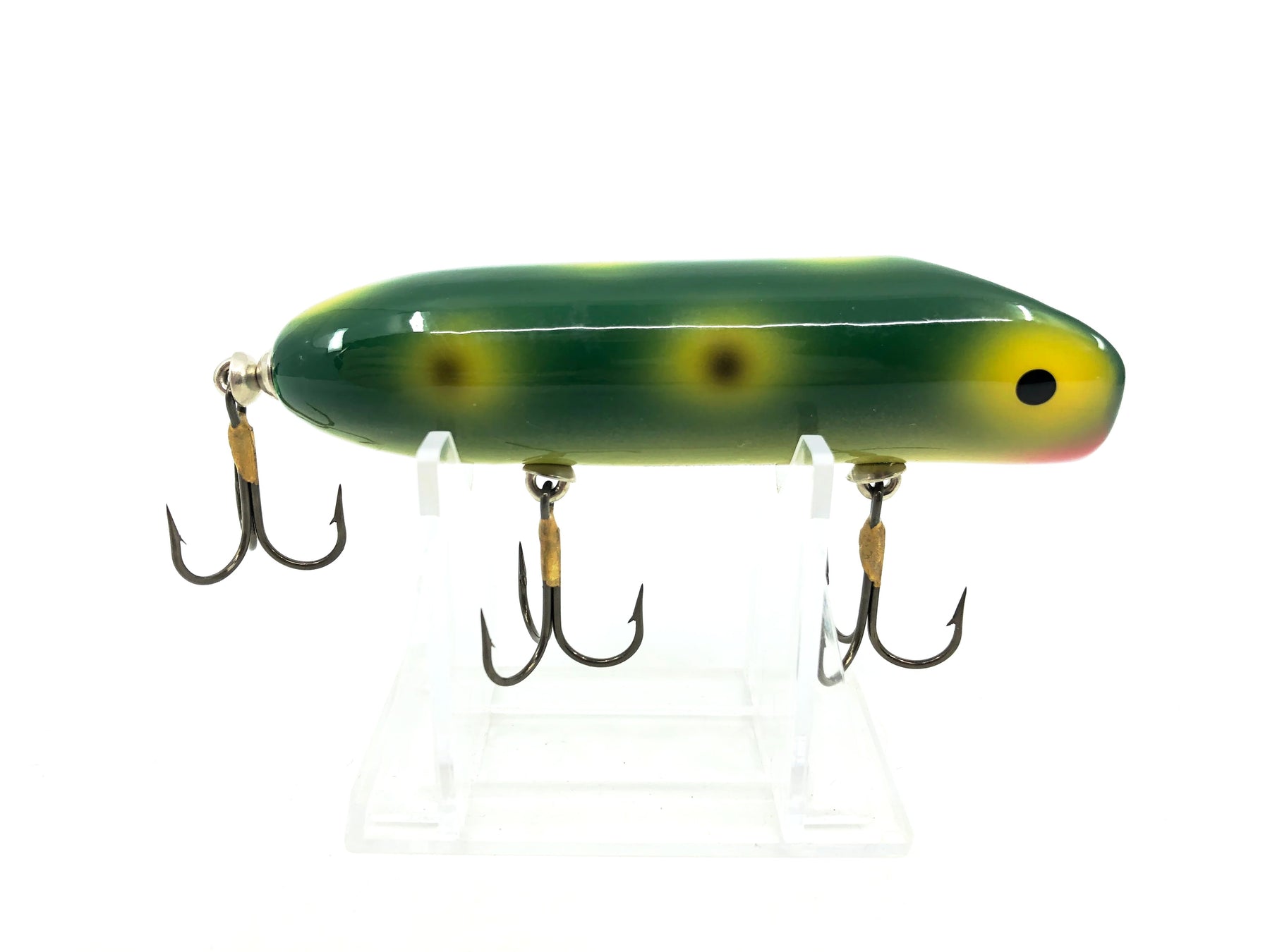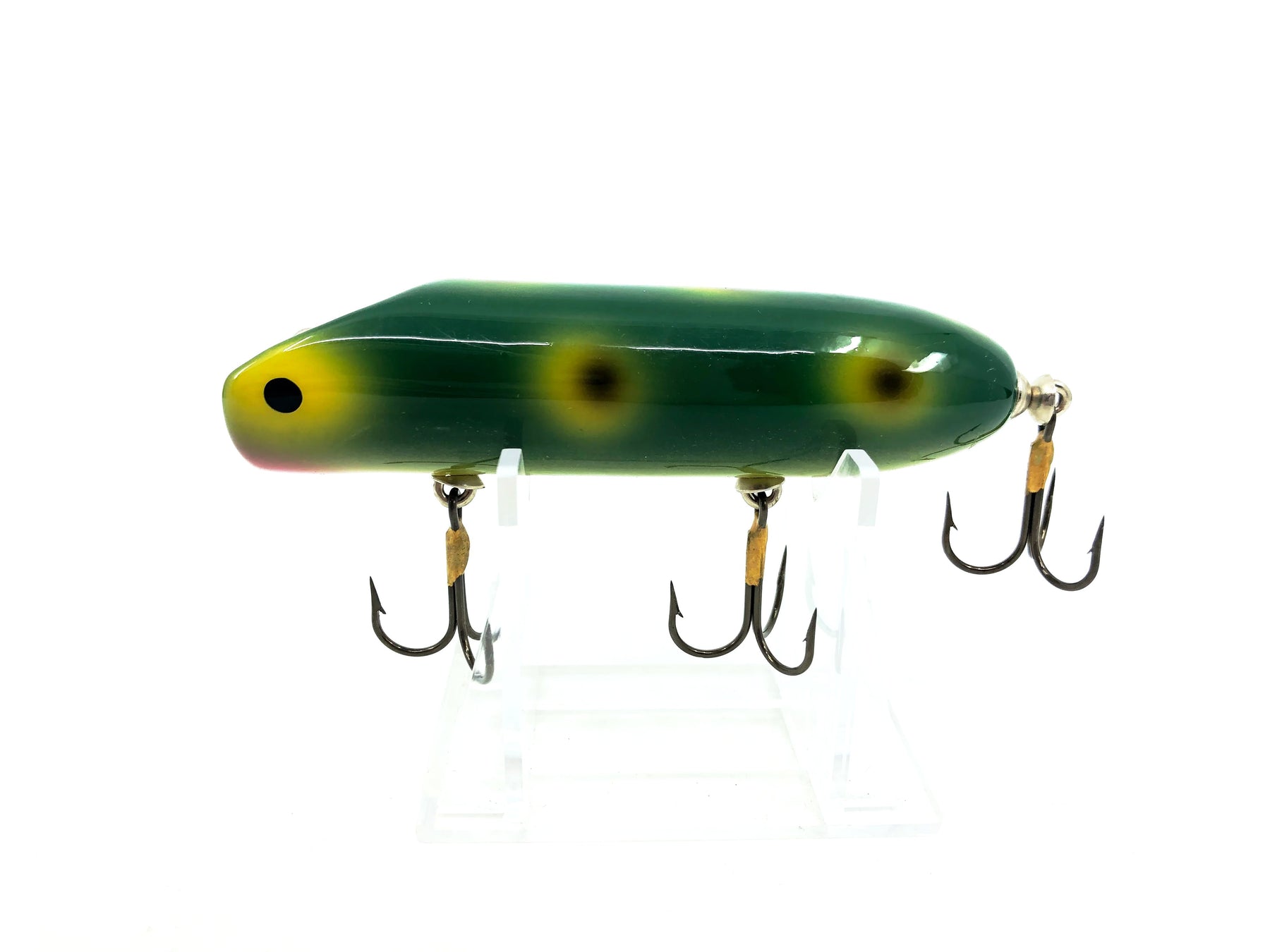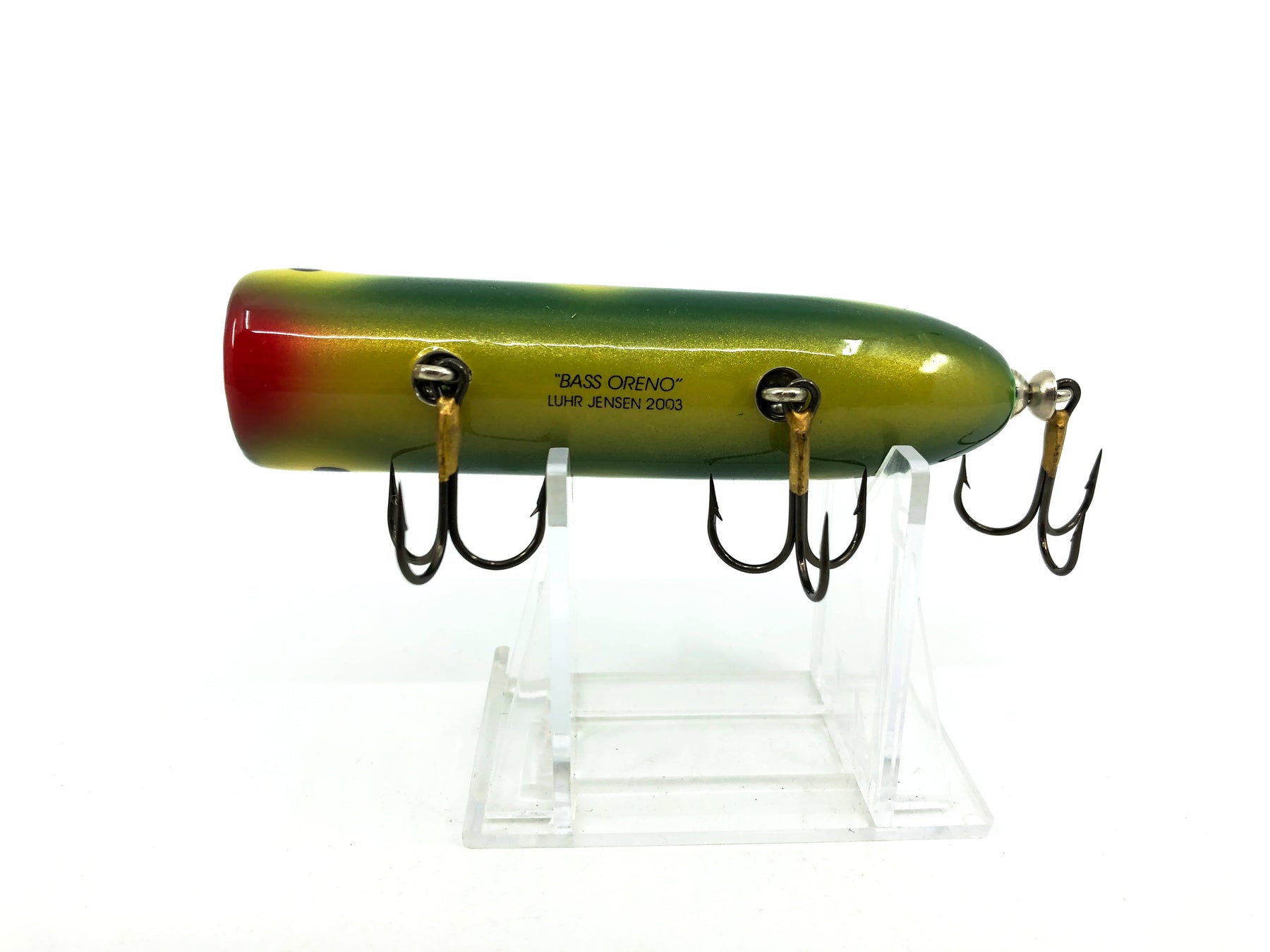 Luhr-Jensen South Bend Original Bass-Oreno 2003, Frog Spot Color. About 3 3/4" long. Lure is used but in good condition with minor wear. One of the greatest fishing lures ever made. Fish or collect you can't go wrong on this one. See photos. One of the all time classic baits in wood.