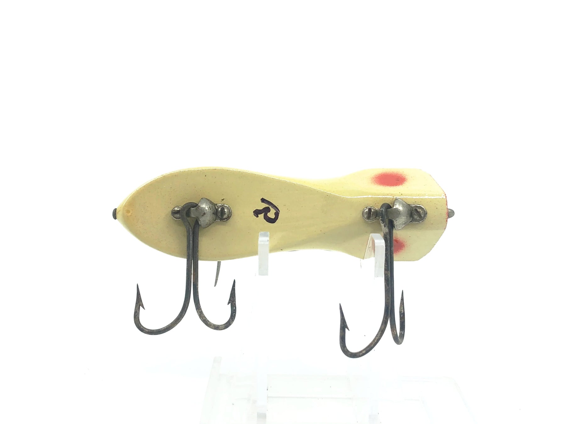 Pflueger Wizard, Repaint White/Gold Dots Color. About 3 1/4" long. Great vintage bait here. Lure has been repainted and restored, see photos. Grab this one while you can. I don't find these very often. Very desirable color on this bait.