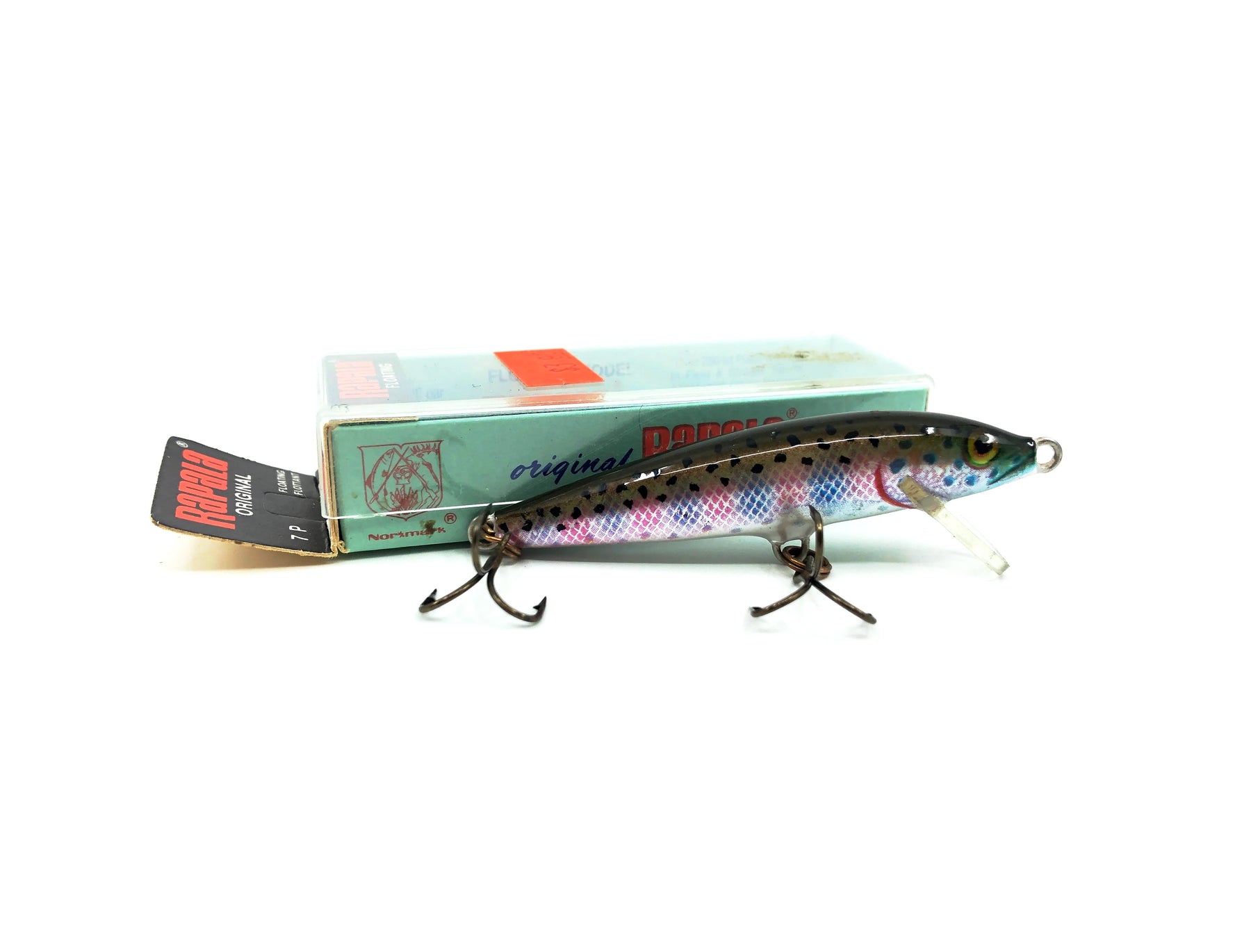 Rapala Floating Minnow F-7 RT, Rainbow Trout Color Lure with Box. Great combo here. Box is for a F-7 in Perch color. About 2 3/4" long. Lure is in good condition though with some minor wear. Box is in good condition as well. Grab this one and go fishing.