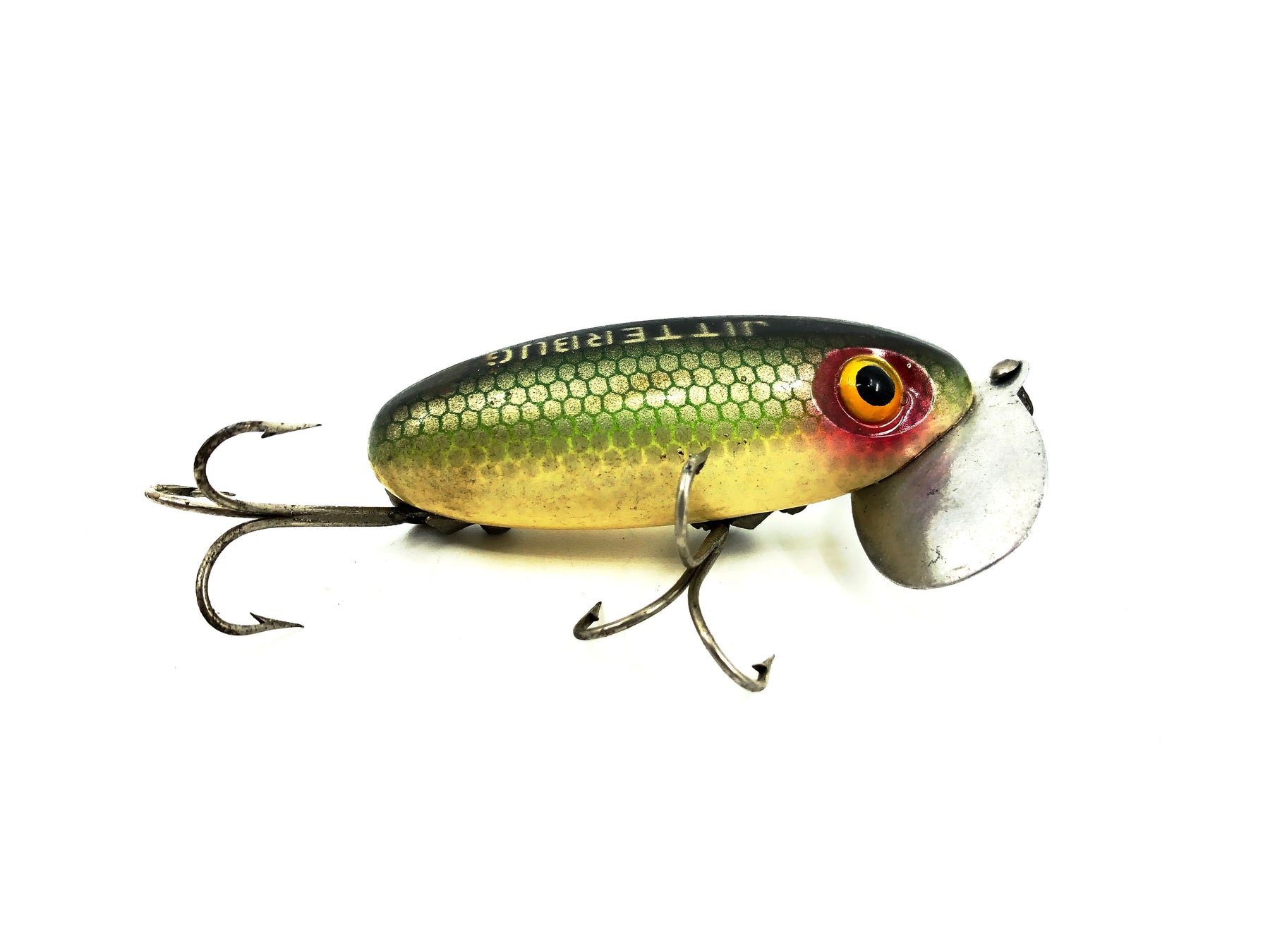 Arbogast Jitterbug Green Scale Color, Vintage Bugged-Eyed Model. Body is about 2 1/2" long. Used with some wear and marks but overall good condition. Fish or display, see photos.
