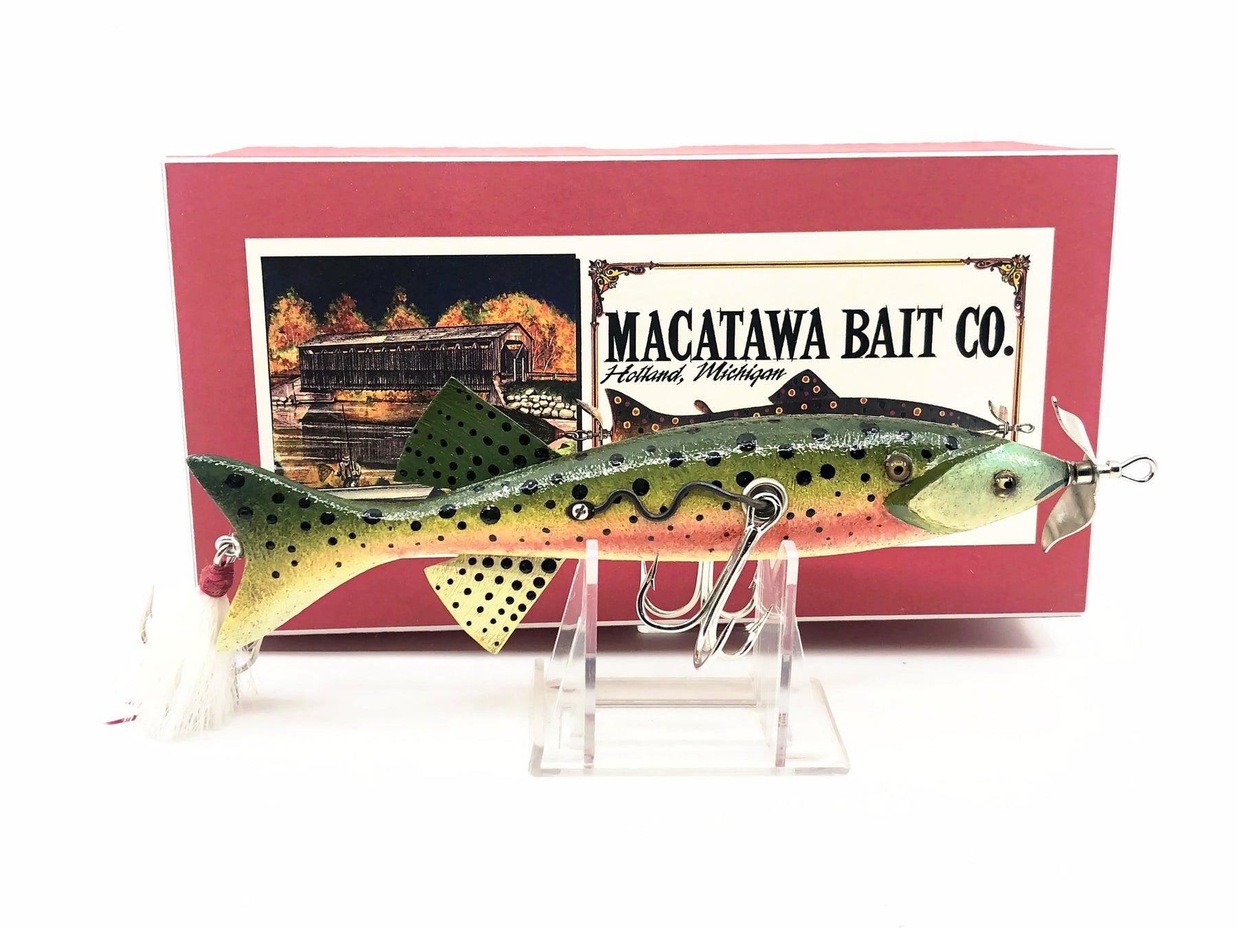 Macatawa Bait Co. Rainbow Trout Fisheatus w/Box. Unique Macatawa bait here. About 7 1/8" long body not including the spinner. Wooden lure, glass eyes (on both fish). Lure is in great condition. Box in great condition with a little storage wear. See photos. One of the tougher models to find.