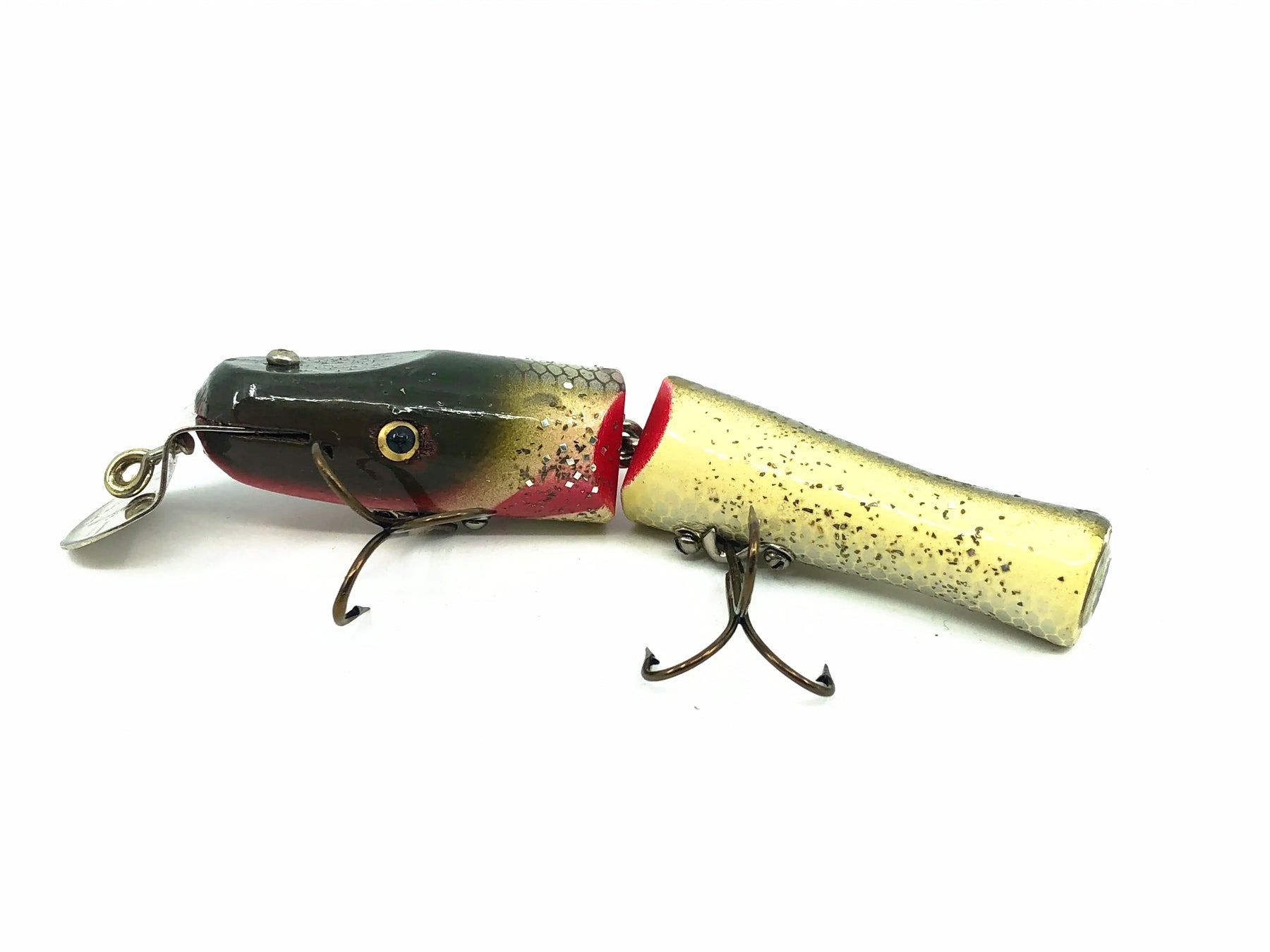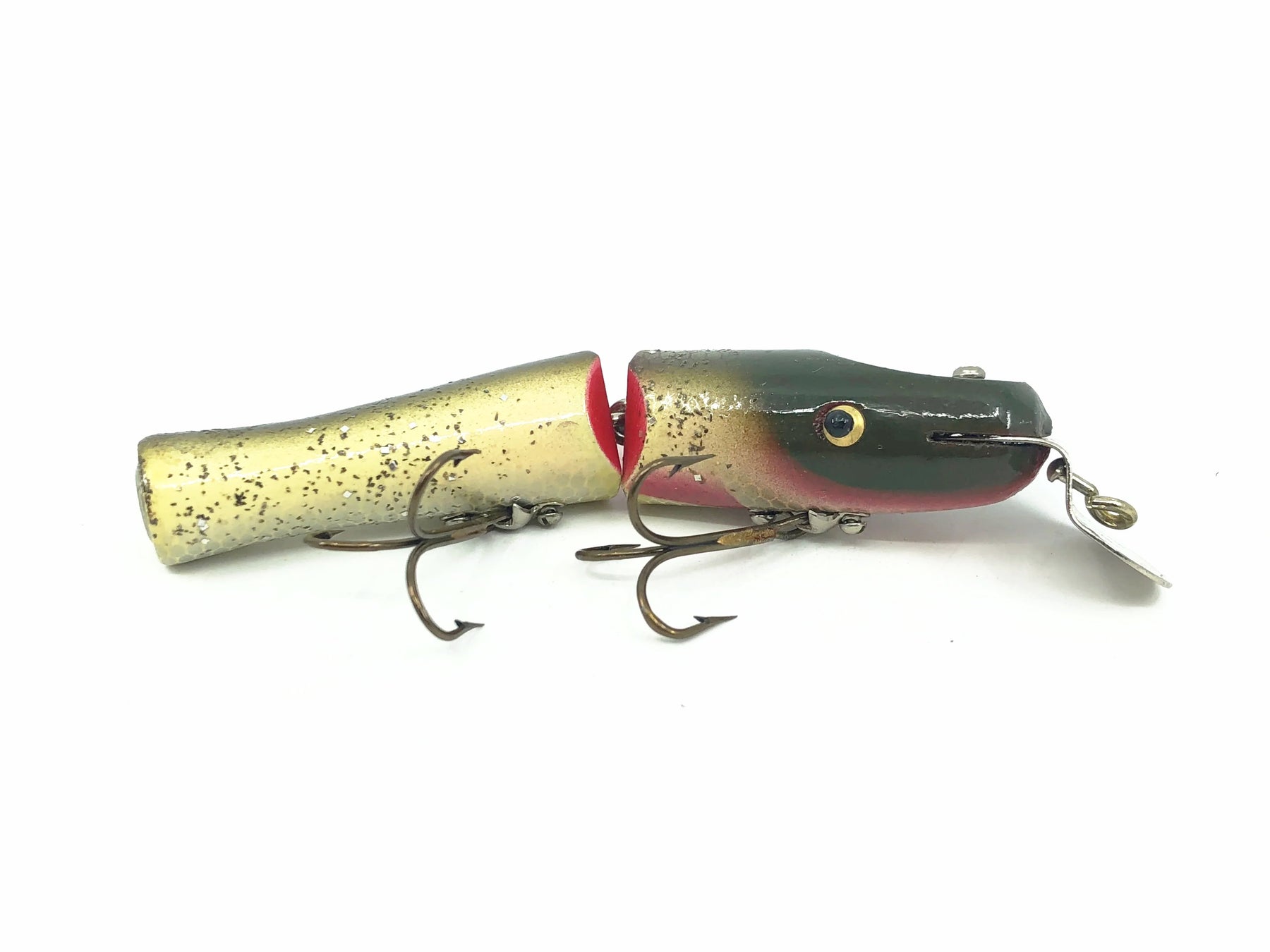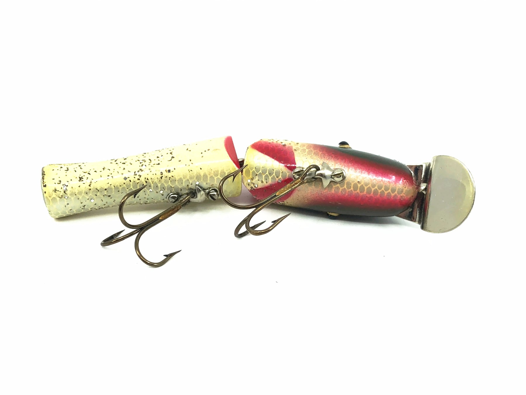 Lucky Strike Jointed Wooden Pikie, Silver Flitter Color. About 4 1/2" long not including lip. Lure is used with minor wear but in good shape aside from the back hook is missing. Tougher to find these lures. Wooden lure and beautiful. See photo and grab this one while it lasts!