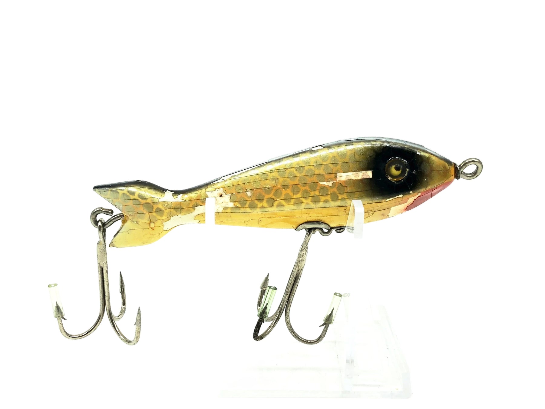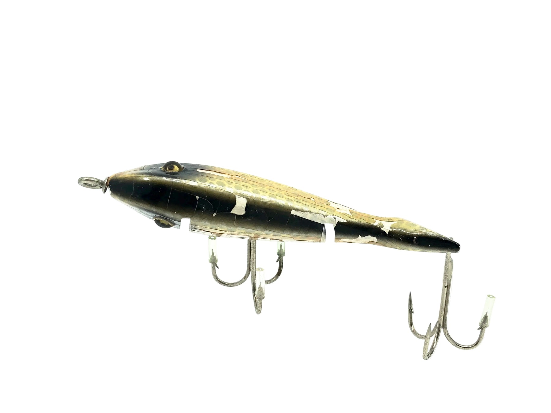 Heddon #600 Salterwater Special (Big Joe), 9P Shiner Scale Color. Wooden body is about 3 1/2" long. This color and lure was only made for a few year(s) in the 1920s. Wooden lure, glass eyes. Used lure with wear and a few spots of chipped bait but in overall fair condition. See photos. Grab this one while you can. Don't see many of these around. Almost 100 years old.
