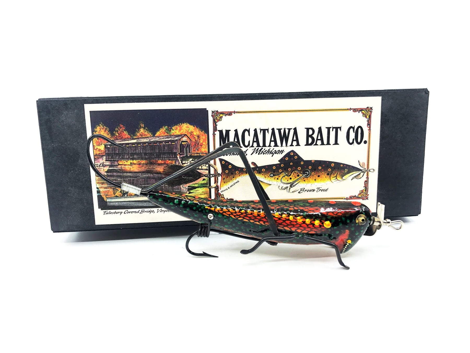 Macatawa Bait Co. Large Grasshopper Lure w/ Signed Box - Muskie Hopper. Classic Macatawa bait here, made in 2022 (marked on the belly). Lure is about 7" long from back hook to line tie. Wooden lure, glass eyes and metal legs. Lure and box are in amazing shape with just a little storage wear on the box. See photos. Signed on back of box by Tony Smith.