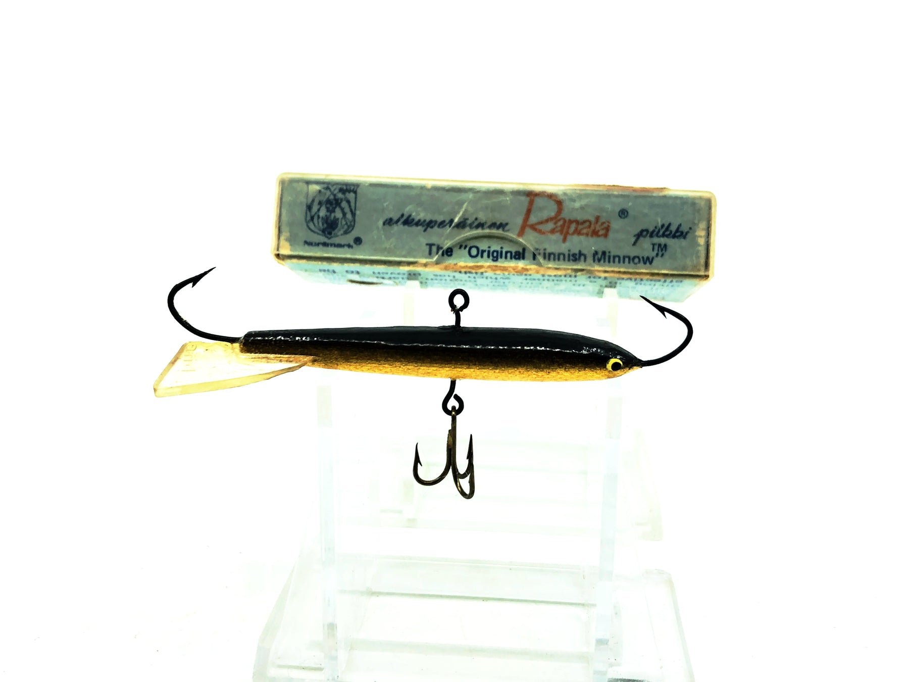 Ideal for summer or winter jigging. Excellent for all game fish the lure swims in a circle when jigged up and down. Reaches fish through the ice or deep holes unobtainable through other methods of fishing. Designed and made by Lauri Rapala and Sons of Finland. Note balanced design and center eyelet positioning. Has two single reverse hooks plus centered treble hook. Lead weight constructed.