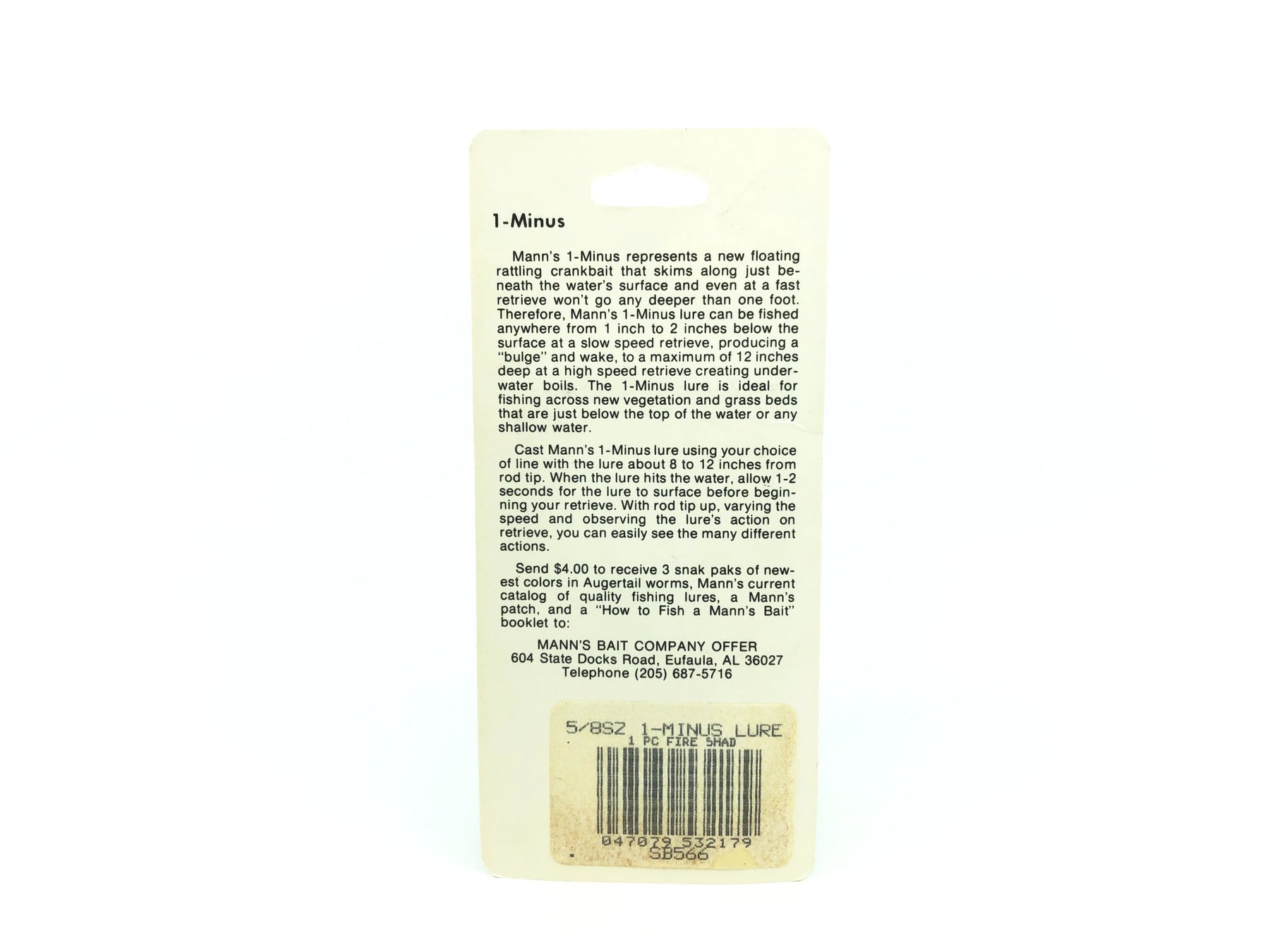 Mann's 1- Minus, Fire Shad Color on Card. These lures are insanely desirable ever since Mann's closed their doors. Bait has about 3" long body. Bait is new on card. Card has some minor wear but is in overall good condition. See photos.
