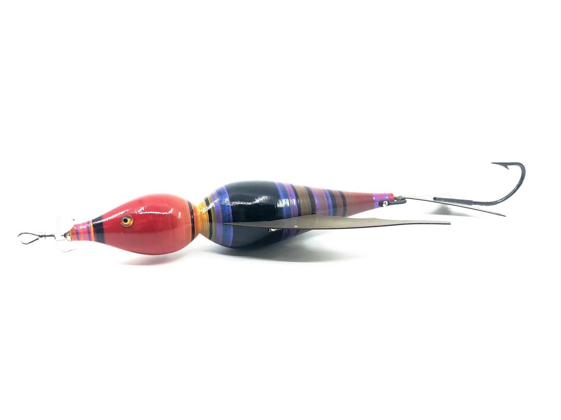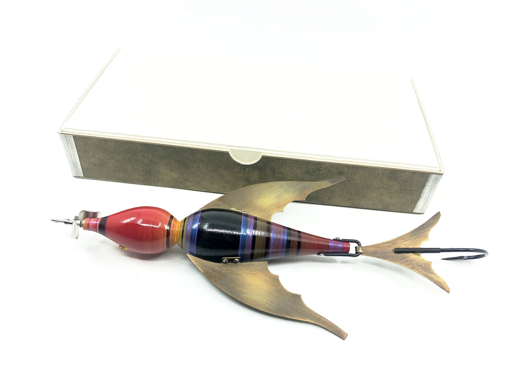 Macatawa Bait Co. Musky Bird, Red/Yellow/Black/Blue Color w/Box. Unsure about the color name on this one. Fixed wings on this model, movable tail. About 6" long body not including the hardware or metal tail (about 9 1/4" overall). Lure is in great condition. Box in great condition with a little storage wear. See photos.