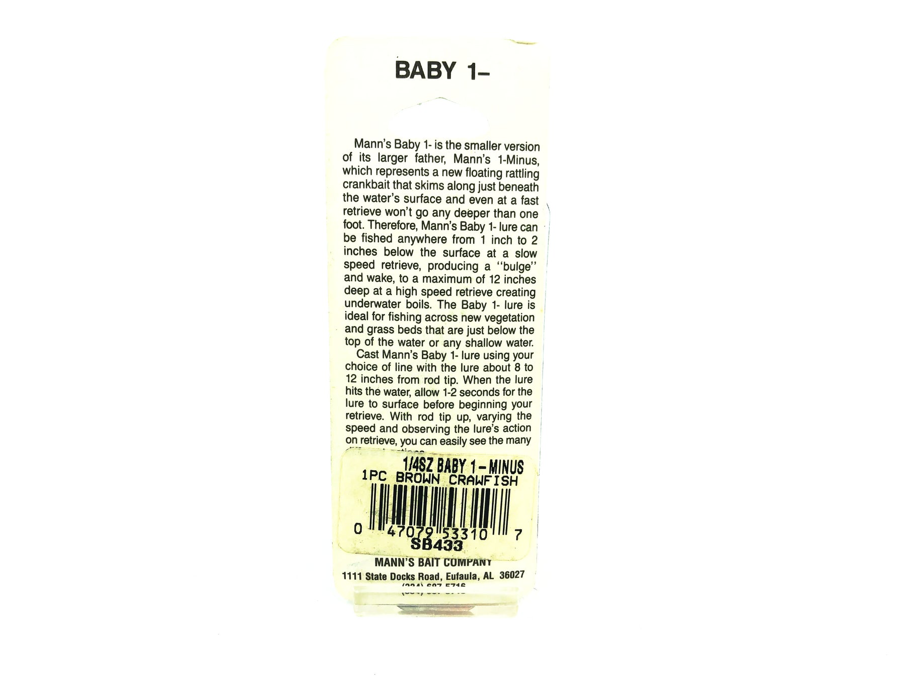 Mann's Baby 1- Minus, Brown Crawfish Color on Card. Double stamped model here. These lures are insanely desirable ever since Mann's closed their doors. Bait has about 2 1/4" long body and weighs 3/8oz. Bait is new on card and the card is in good condition. See photos.