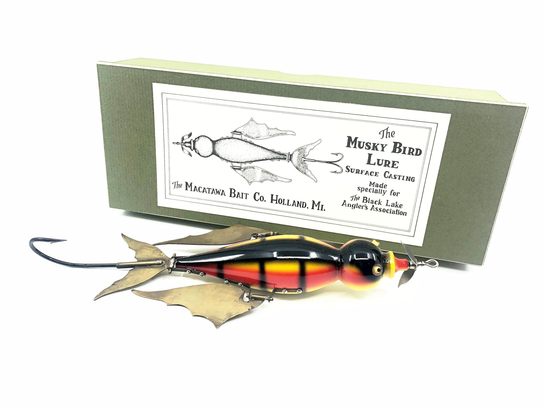Macatawa Bait Co. Musky Bird, Red/Yellow/Black Color w/Box. Very early Macatawa Musky Bird with an early uncommon box. This bird has a different body then the newer model. Movable wings and tail. About 6" long body not including the hardware or metal tail (about 10" overall). Lure is in great condition. Box in great condition with a little storage wear. See photos.