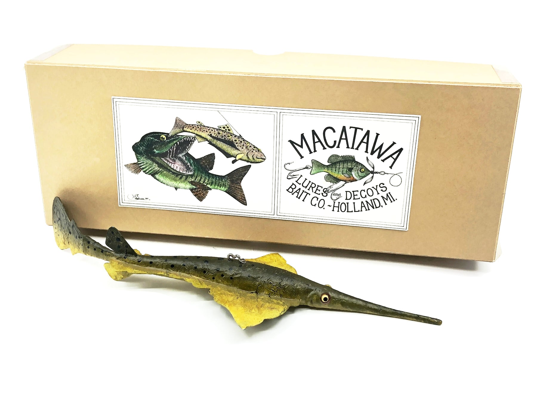 Macatawa Bait Co. Gar Pike Decoy w/Box. First thing to note on this pristine early Tony Smith Decoy is that the previous auction house who had this lure placed a sticker on the back of the box. Classic Macatawa bait here straight out of the old Macatawa order sheet. Decoy is about 10 1/8" overall. Wooden decoy, glass eyes and metal wings. Decoy is in amazing shape. The box has a slightly loose side with the corner tape loose on multiple sides and has the auction house sticker on the back. See photos.