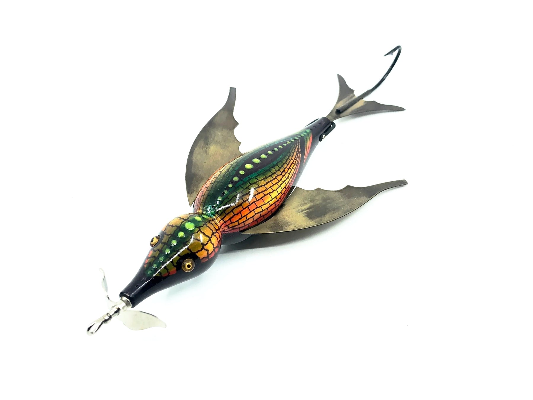 Macatawa Bait Co. Musky Bird/Duck, Green/Orange/Yellow Scale w/Box. Newer Musky Bird/Duck. Wooden body of this bait is about 6 1/2" and it's overall 10" long. Wooden bait, glass eyes and metal wings. Bird is in amazing shape. The box is in good condition as well. See photos. Great details on bait. Fixed wings, movable tail.