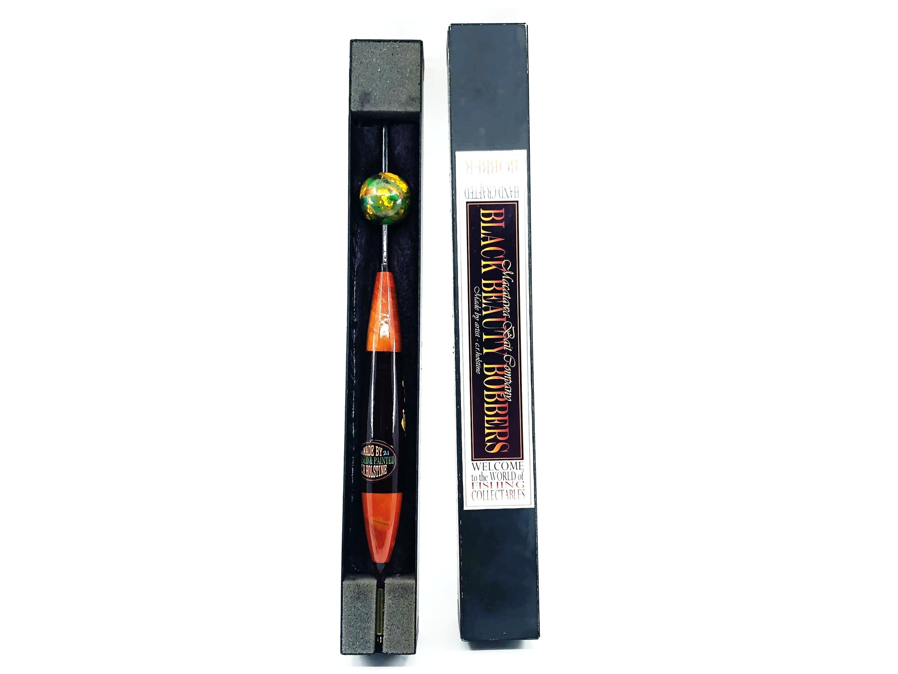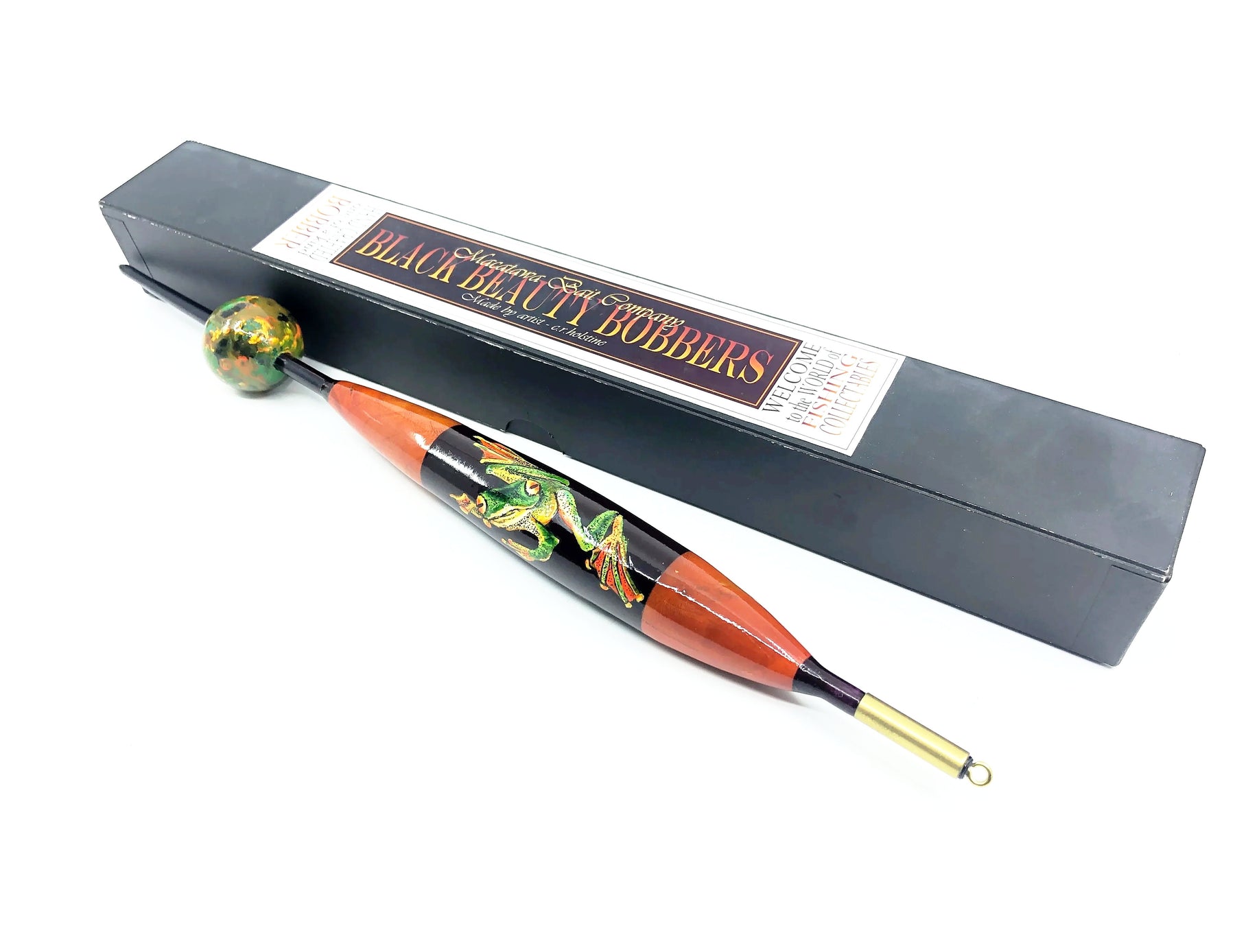 Macatawa Bait Co./Black Beauty Bobbers Tree Frog 16" Bobber w/Box. Rare Float here. Float is about 16" long overall. Both float and the matching box are in great condition. Made in 2021. See photos.