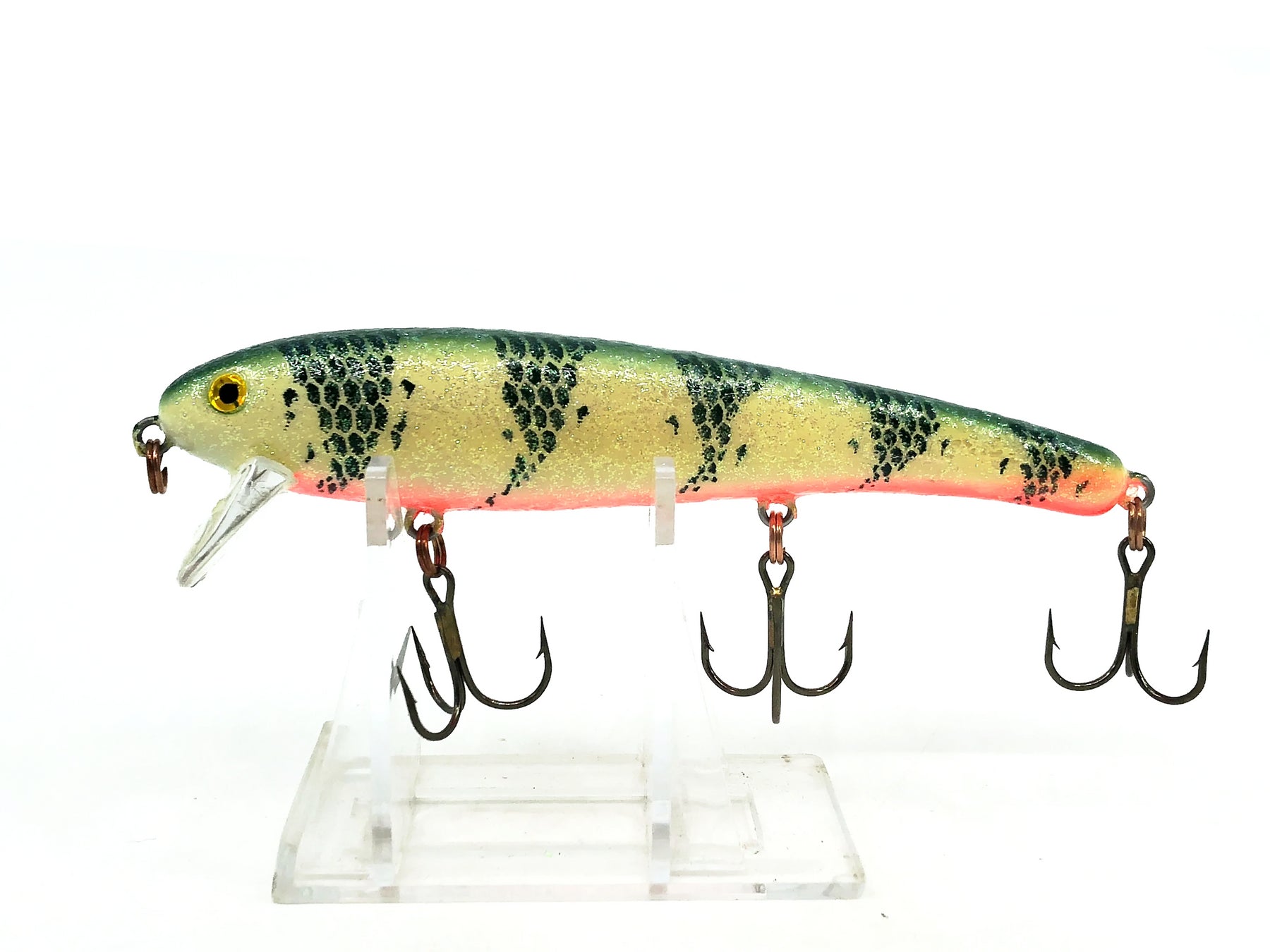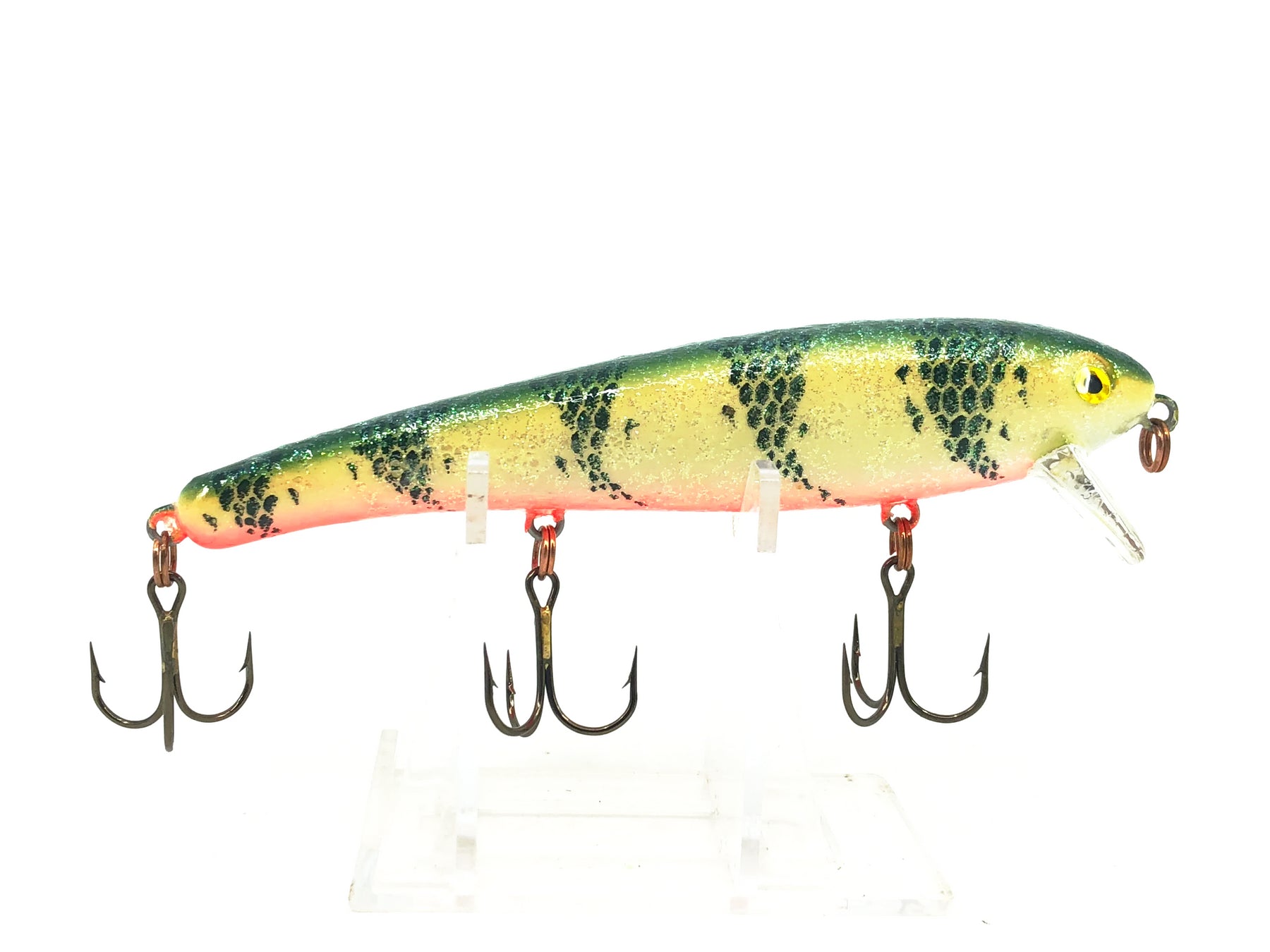 Mann's Stretch 1- Minus, Yellow Perch Crystaglow Color. These lures are pretty desirable ever since Mann's closed their doors. Bait has about 4 1/2" long body and weighs 1/2oz. Lure has some minor wear but in overall good condition. See photos.