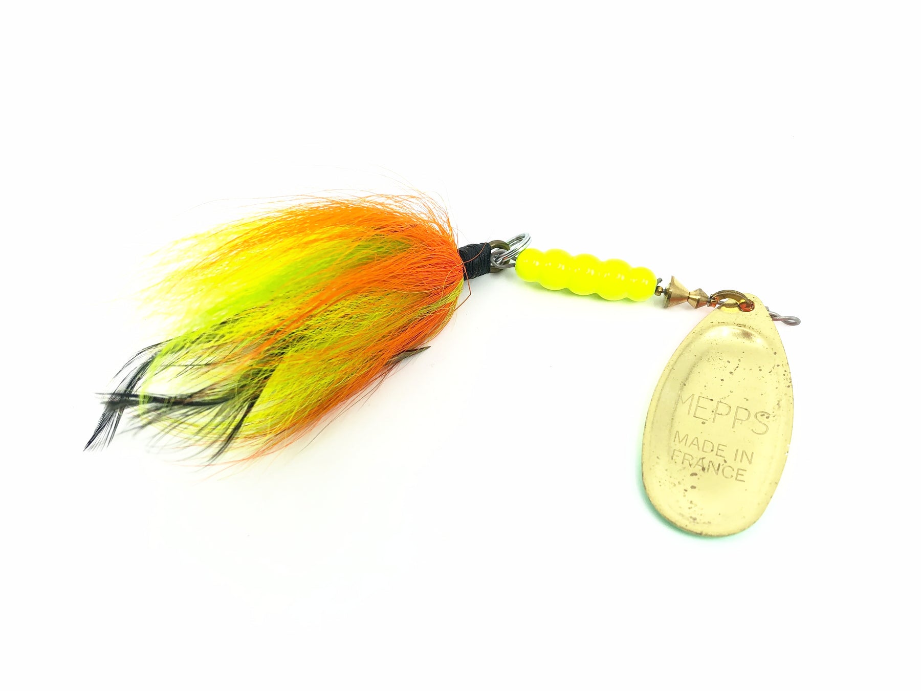 Mepps Magnum Musky Killer, Hot Firetiger Blade & Bucktail Color. This classic spinner is about 5 1/8" long excluding the bucktail. Spinner is in good condition with some minor wear and chips. Fish or collect, see photos.