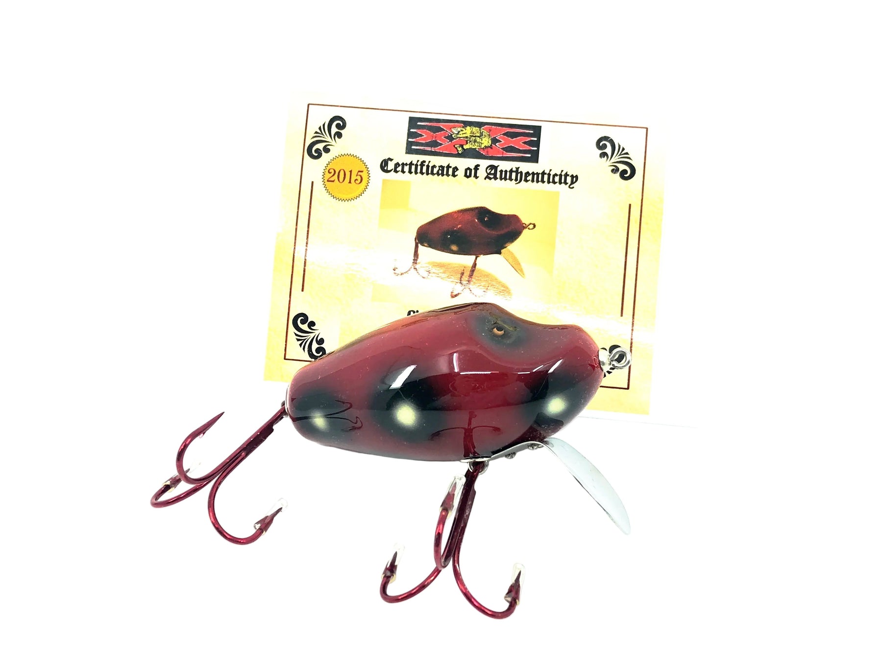 Musky Dan (XXX Lures) Giant Little Dude, Maroon/Black/White Spots Color. Cool take on the classic Musky Dan Little Dude lures.  Lure body is about 4" long not including the lip. Wooden lure, glass eyes. Lure is in amazing shape. This bait was made and bought in 2015. Ever since then it has sat, stored properly in one collection.  Highly sought after Musky lure from both fisherman and collectors.  Fish or collect.