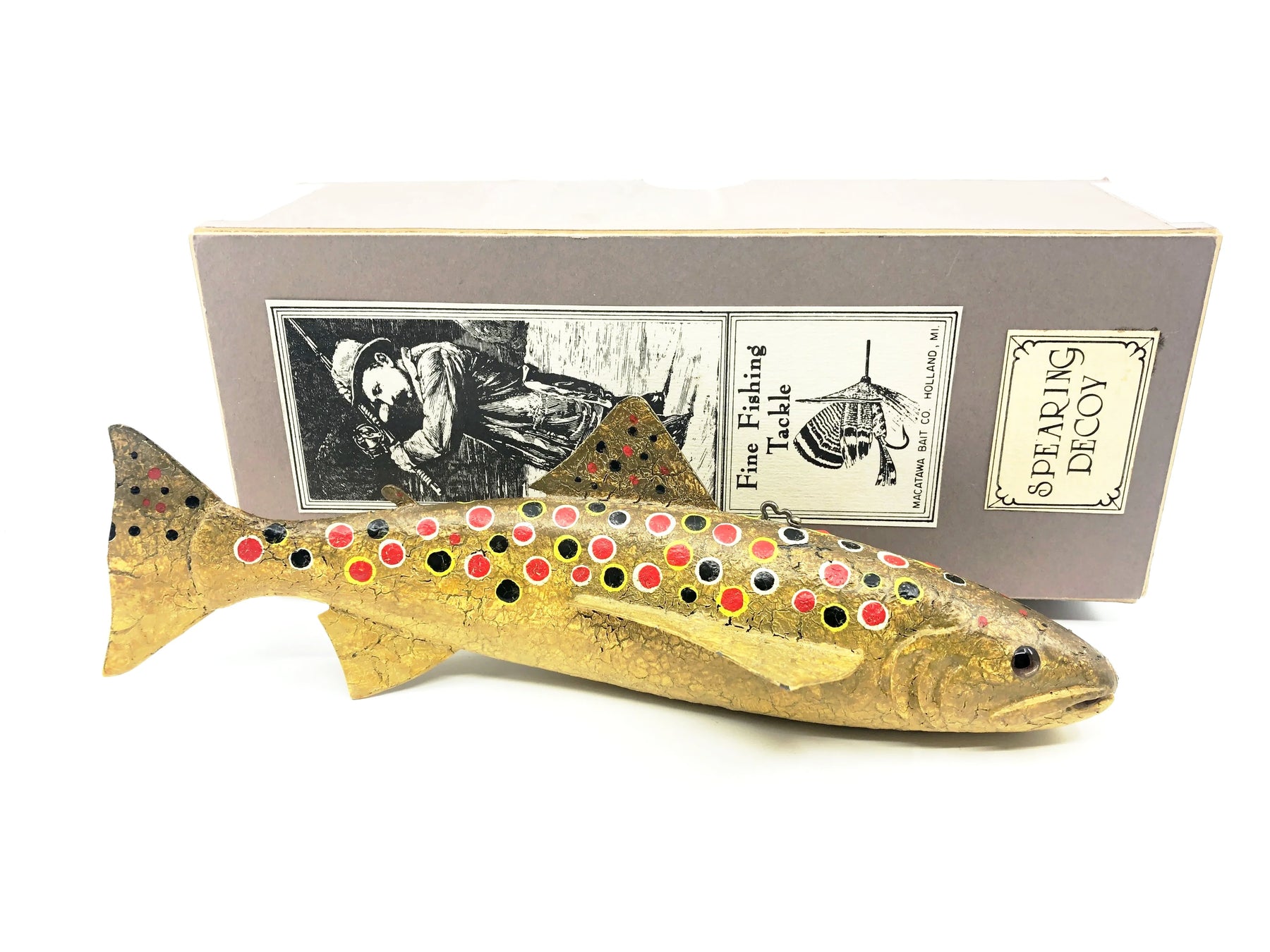 Macatawa Bait Co. Early Brown Trout Decoy w/Box. Very early Macatawa decoy and box here. This decoy is about 9 1/2" long overall. This decoy has some minor marks and a good amount of cracks in the paint (or that is the style it was done) from years of storage. Box is in good condition as well with some minor storage wear. See photos. Glass eyes.
